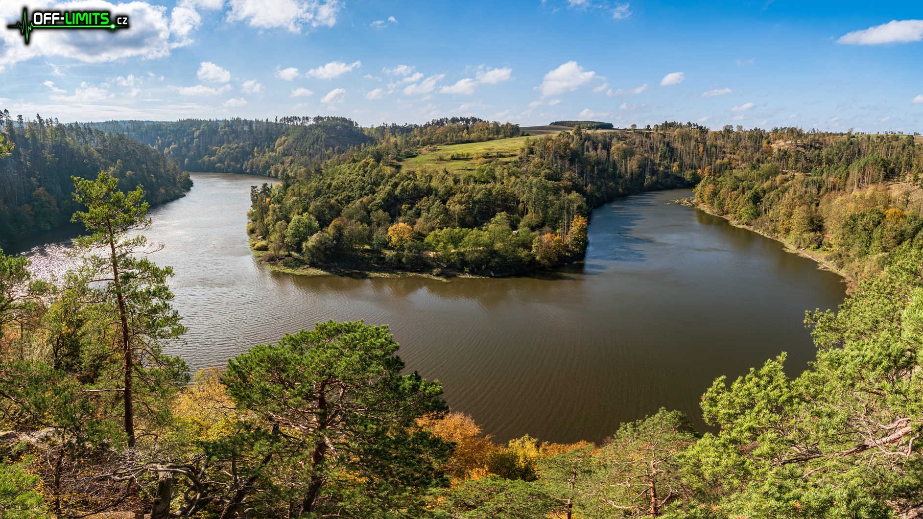 Panoramatický výhled na koryto Dalešické přehrady a Jirkasův mlýn z Kozí skály
