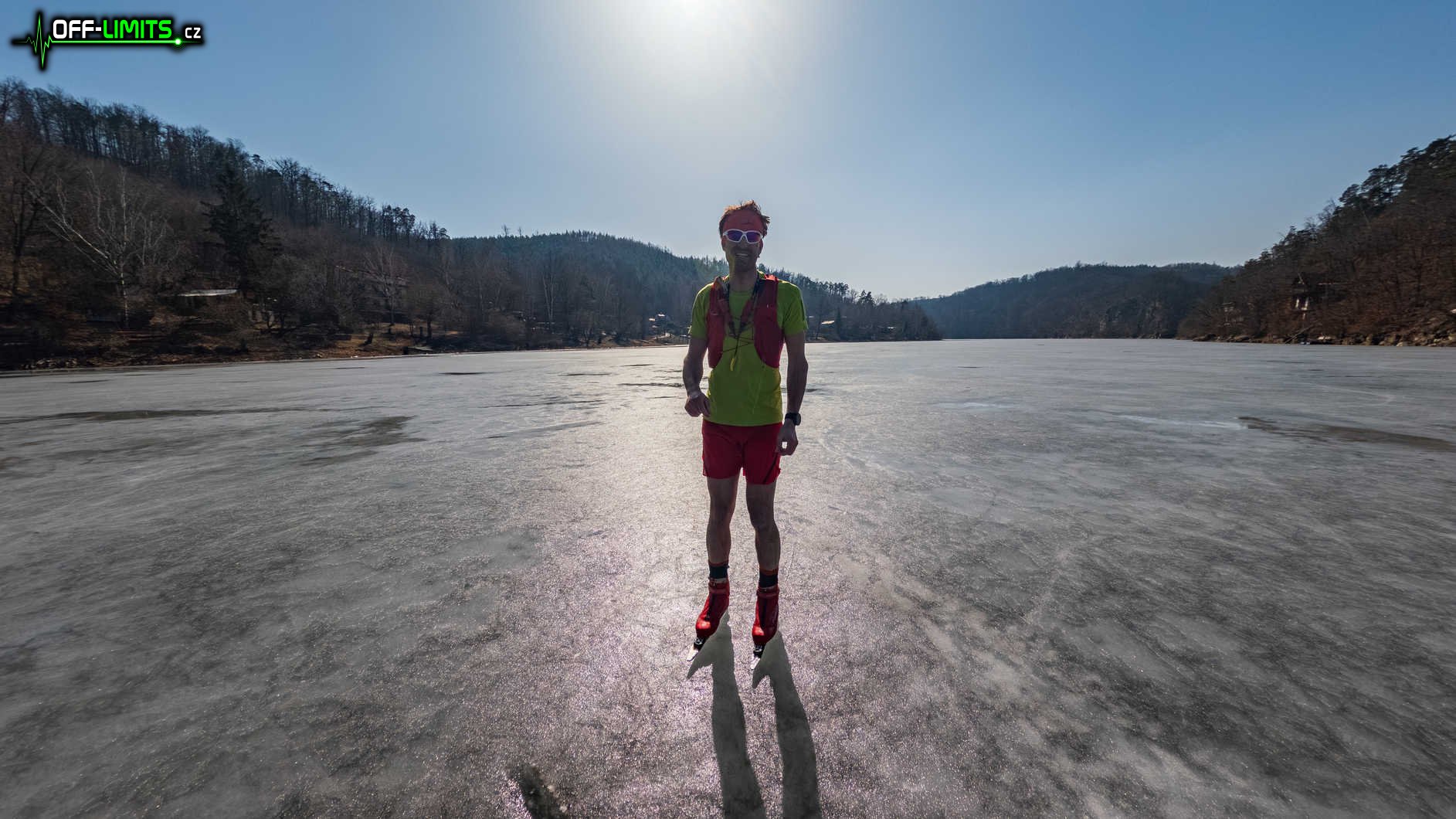 Pak už to byla klasika. Projeli jsme všechny zátoky, navštívili přítok řeky Želetavka pod hradem Bítov a zamířili proti proudu. Když jsme překonali poslední trhlinu pod Vysočanským mostem, tak se při pokusu o posunutí prkna, prolomil led a já se opět koupal. Bohužel jsem to v těchto místech vůbec nečekal, takže jsem tam zahučel i s foťákem, a ještě si udělal pavouka přes celý mobil. Po vylezení zpátky na led jsem ze sebe sundal mokré oblečení, a protože bylo kolem 15 stupňů a svítilo slunce, dál už jsem bruslil pouze v kraťasech a krátkém tričku.