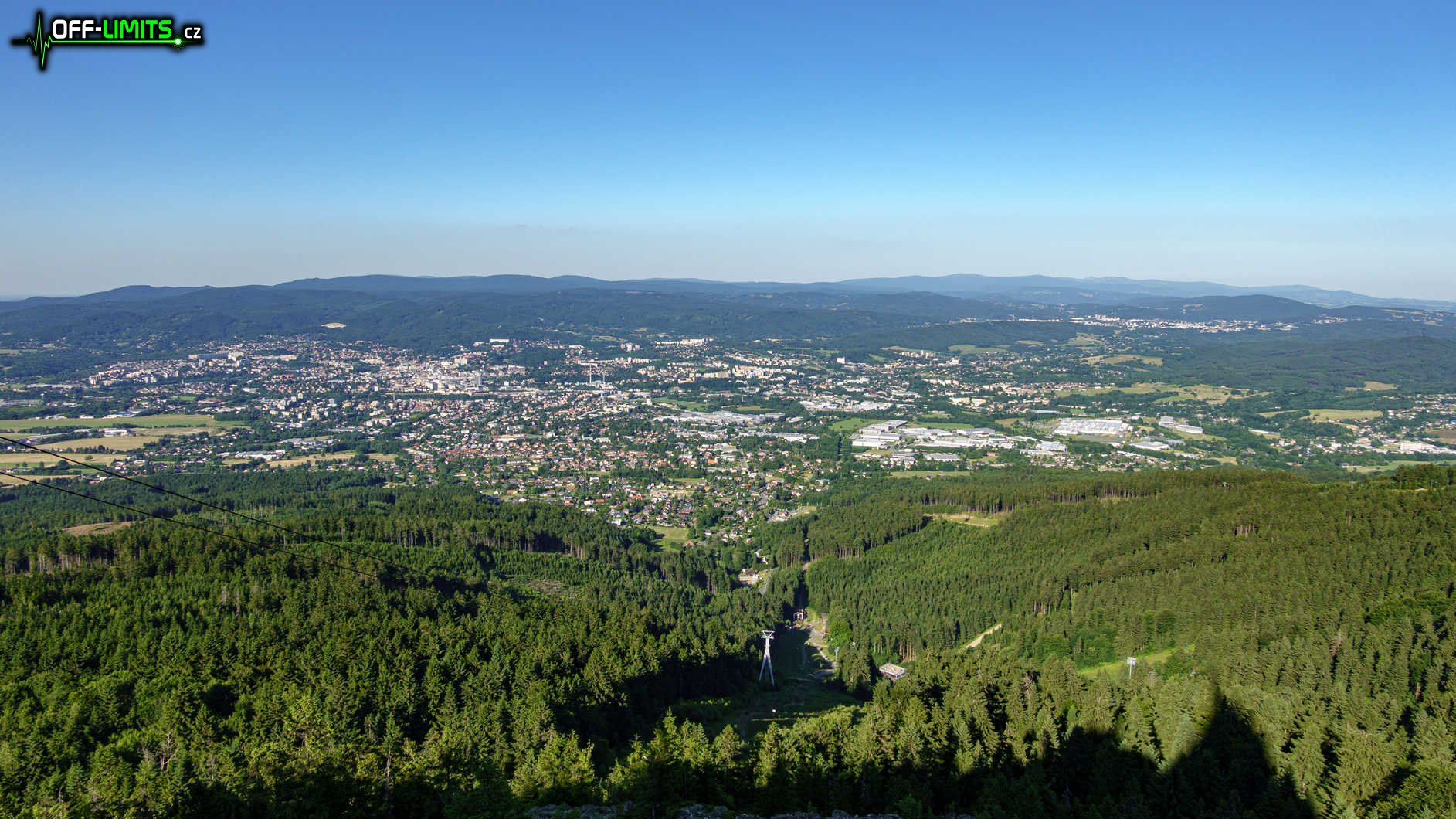 V Tetřevím sedle (Výpřež) jsem odbočil na žlutou značku, která mě dovedla k první skalní vyhlídce Kamenná vrata, ze které byl výhled opět severozápadním směrem. O chvíli později jsem doběhl na skalní vyhlídku Červený kámen, ze které je výhled pro změnu směrem jihozápadním, takže je i vidět Český ráj. A jako bonus z ní byl nejlepší výhled na vrchol Ještědu. Po červené značce jsem přeběhl po úbočí úplně na druhou stranu, kde se nad silnicí nachází několik skalních útvarů, na kterých se provozuje lezení. Na pár z nich jsem si vylezl a měl tak panoramatický výhled severovýchodním směrem zpátky na Liberec a za ním na výrazné pohoří Jizerských hor a Krkonoš. Nakonec mi zbývalo zdolat prudké stoupání po neznačené, kamenité cestě pod lanovkou.
