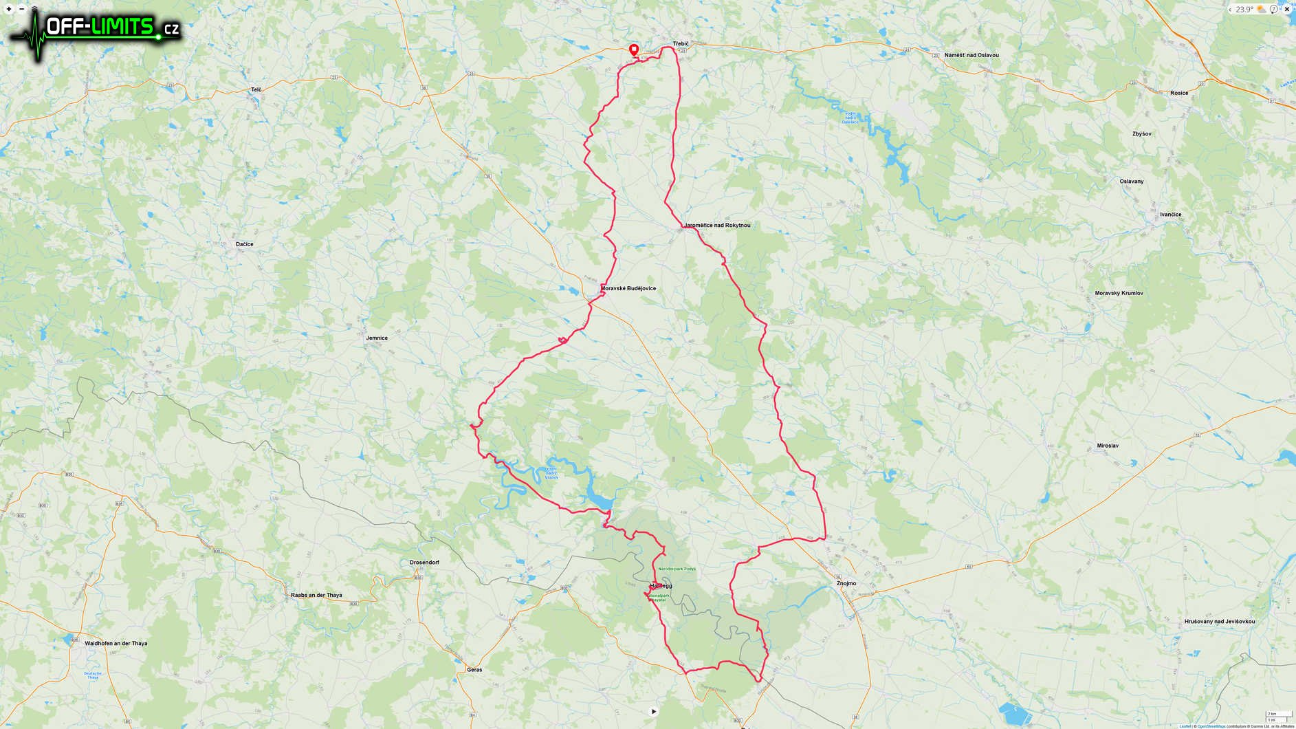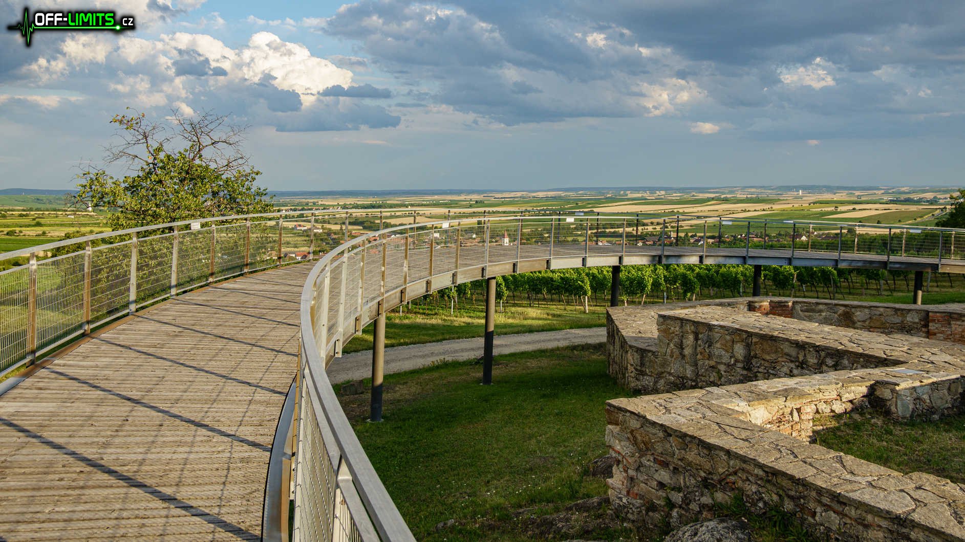 Vjel jsem do národního parku Podyjí a po náročné, nezpevněné cyklotrase vystoupal na úbočí kopce Větrník, odkud jsem naopak sjel do obce Čížov. Občerstvil jsem se u samoobslužného stánku a kolem památníku železné opony zamířil dolů k Rakousku. Krátce jsem ještě odbočil ze silnice a navštívil Hardeggskou vyhlídku. Pak už jsem po silnici, kde se to hemžilo ještěrkami, sjel k řece Dyje (Thaya) tvořící česko-rakouskou státní hranici. Přejel jsem most a dostal se tak do rakouského městečka Hardegg. Na návsi jsem u pumpy doplnil pití a po serpentinách vystoupal národním parkem Thayatal nahoru na pole. Následující úsek byl příjemně odpočinkový. Po krásné silnici jsem ve večerních hodinách projel obcemi Merkersdorf a Niederfladnitz (Dolní Blatnice) až k obci Mitterretzbach, kde jsem odbočil k vyhlídkové plošině u poutního místa Heiliger Stein (Svatý kámen). Protože se tam hemžilo velké množství lidí, moc dlouho jsem se nezdržoval. Pouze jsem se rozhlédl po krajině, ve které se proháněly bouřky, a pak už jsem zamířil směrem domů.