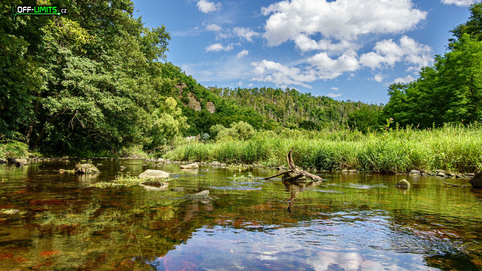 Po silničním mostě jsme se vrátili na původní břeh a po červené značce zamířili proti proudu řeky Jihlava. U Mohelenského mlýna jsme se vykoupali v náhonu s ledovou vodou a za Čertovým ocasem vystoupali nahoru k vyhlídkové plošině. Přeběhli jsme po okraji údolí s výhledem na Mohelenskou přehradu pod jadernou elektrárnou Dukovany k silnici, za kterou jsme pokračovali ke kopci Na Čihladle (371), na jehož úbočí se nachází další skalní vyhlídka. Protože Filip měl na pozdní odpoledne jiné plány, naše cesty se rozdělily. Už sám jsem seběhl dolů k řece, přes splav přebrodil na druhý břeh a zamířil hlouběji do přírodního parku Střední Pojihlaví.