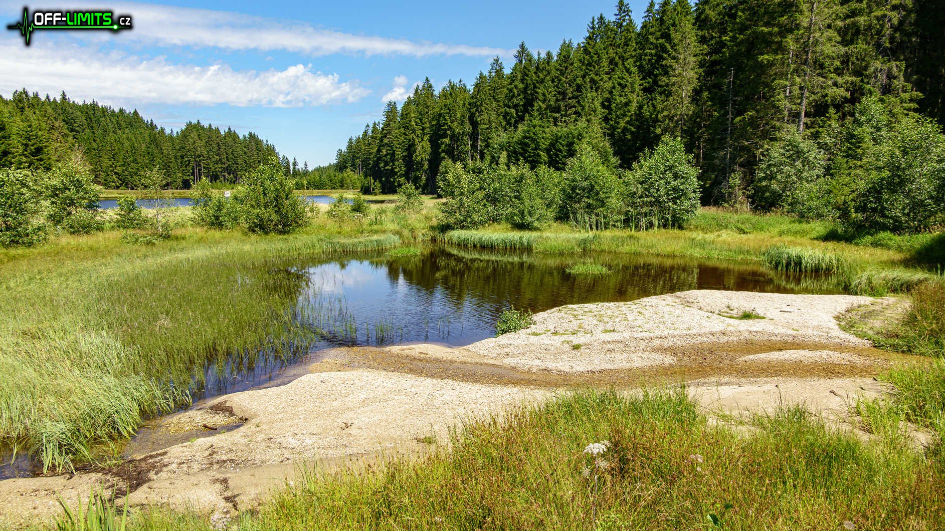 Obloukem se vracím na přírodní památku Pohořské rašeliniště, kde se vykoupu v Pohořském rybníce (Jiřická nádrž). Osvěžen vjíždím opět do lesa a po klikatící se pohraniční asfaltce klesám kolem řeky Malše až k bývalé obci Dolní Příbrání. Odtud přejíždím po jihozápadním úbočí kopce Dopler (956), kde jsou samé výhledy, do obce Malonty. Protože mám ještě dvě hodiny čas, dávám si silniční okruh přes Pohorskou ves do obce Benešov nad Černou, kde si nakoupím zásoby. Potom se přes obec Desky vracím do Malont. Po západu slunce se ještě na otočku zajedu podívat na vyhlídku U Jakla a pak už se definitivně vracím do Malont. Stejně jako v roce 2022 zůstávám u přírodního koupaliště. Noc už je příjemně teplá, takže se konečně vyspím.