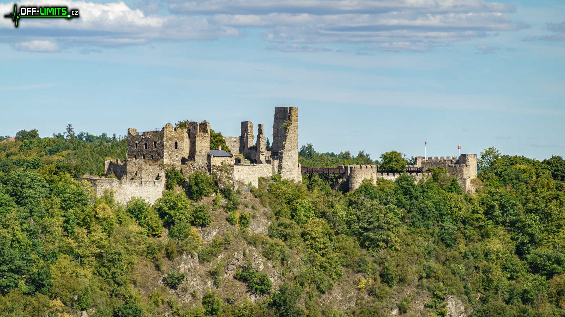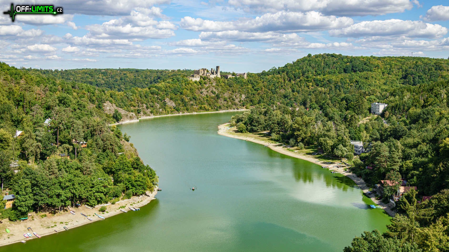 Kolem zříceniny hradu jsem potom seběhl na Výří skálu s výhledem na rekreační oblast Chmelnice. Po Vysočanském mostě jsem se dostal na opačný břeh, kde jsem opět vystoupal na další skalní vyhlídky, ze kterých byly krásné výhledy na poloostrov Hradiště i zříceninu hradu Cornštejn. Po chvíli kochání jsem seběhl do rekreační oblasti Chmelnice, kde jsem se opět občerstvil a doplnil si pití. Tím jsem ukončil nejtěžší a nejpomalejší část u Vranovské přehrady. Využil jsem nadcházejícího závodu Stovka Podyjím a vystoupal roklí kolem potoka, kde to pořadatelé každý rok mačetou prosekávají od kopřiv a bodláků, nahoru do obce Oslnovice.