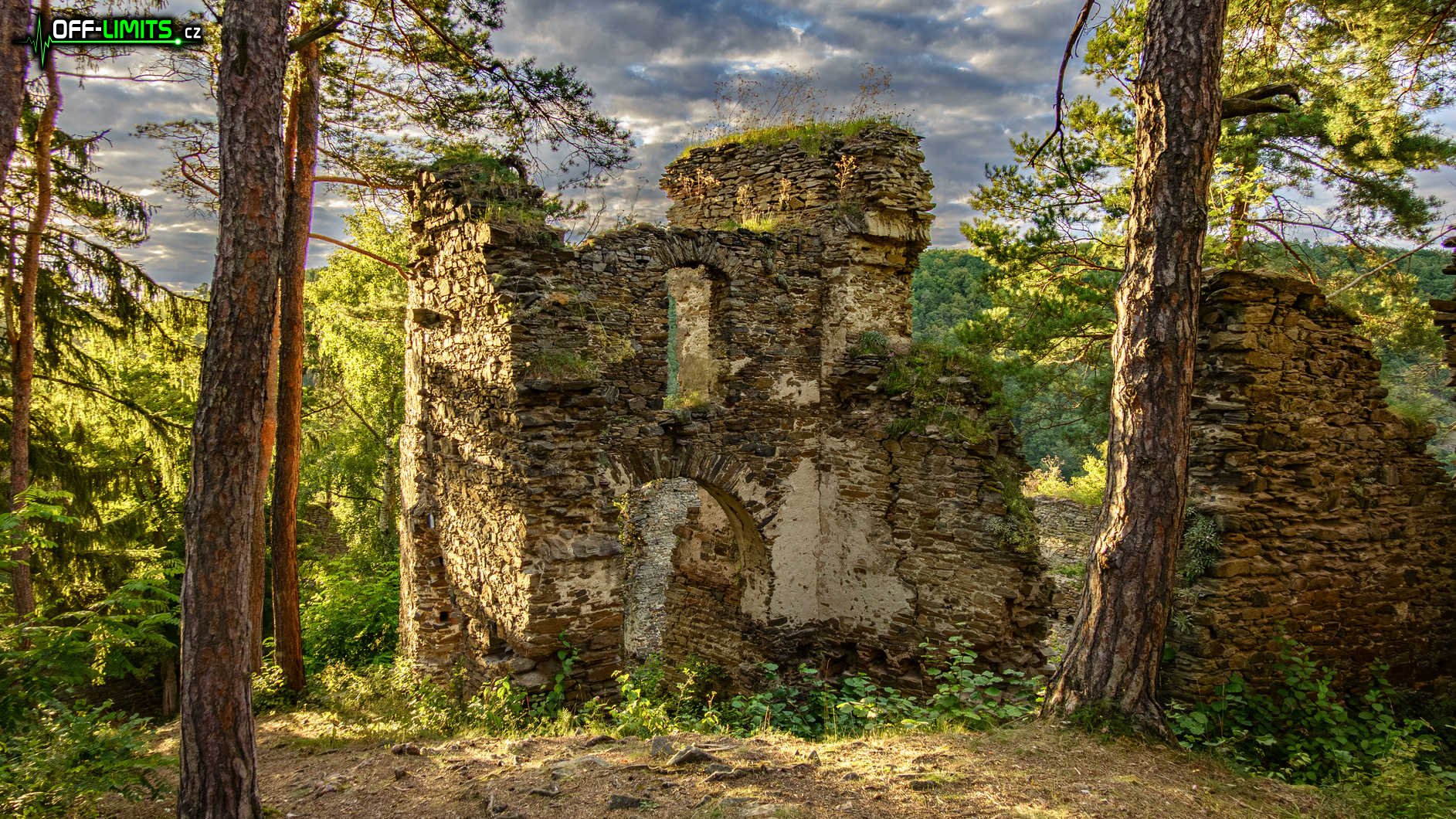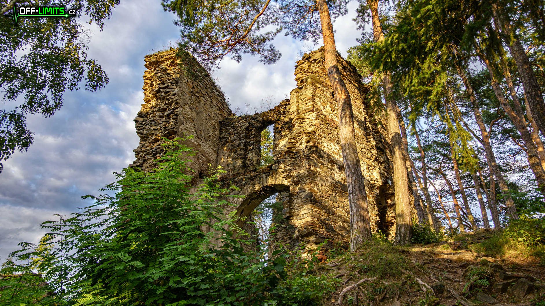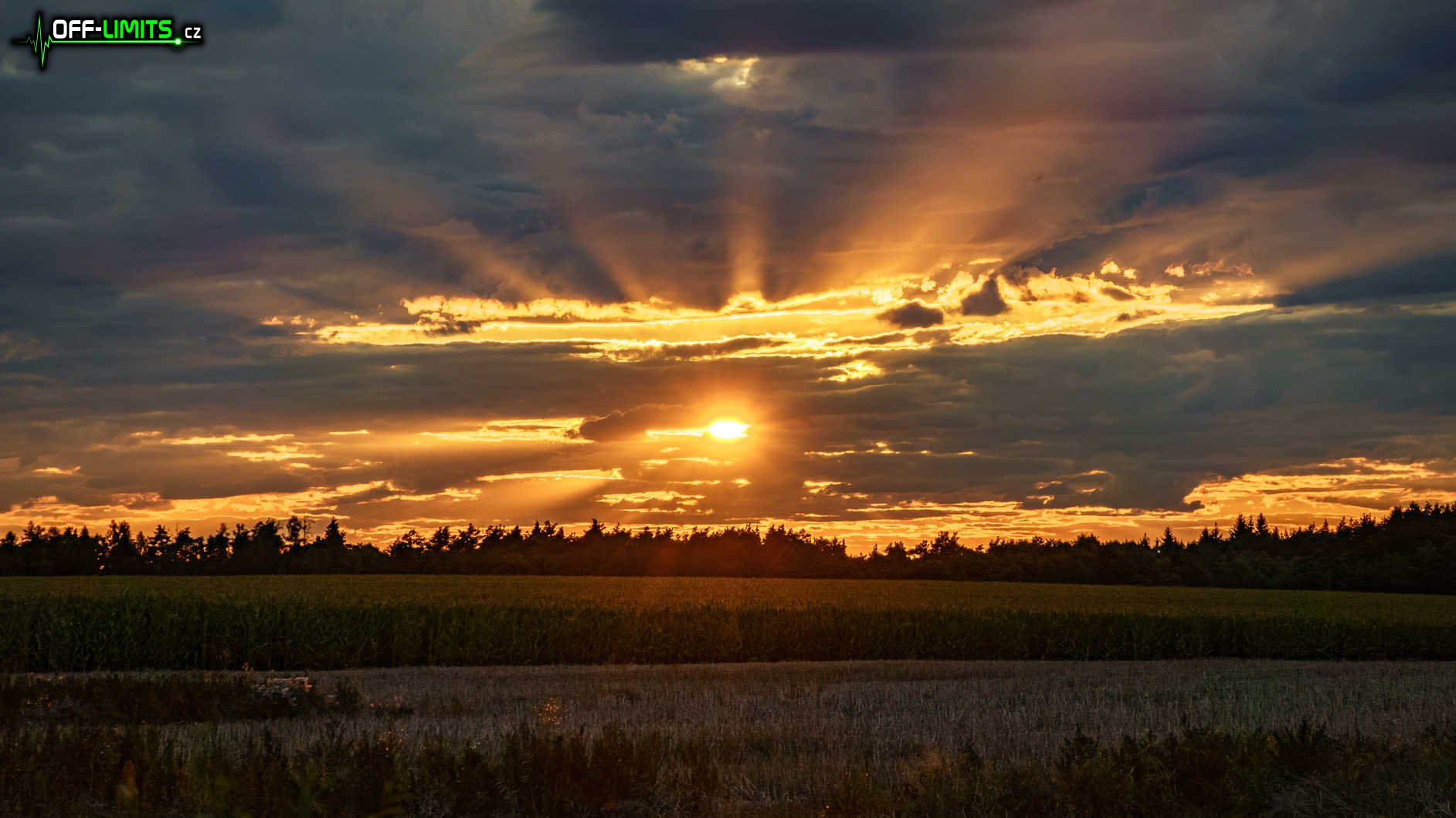 Další zastávka byla moje oblíbená vyhlídka v přírodní rezervaci Podhradské skály s výhledem na obec Podhradí nad Dyjí. Nasvačil jsem se a poté seběhl do Podhradí. Ačkoli bylo chladno, vykoupal jsem se v řece, abych ze sebe smyl prach a pot. Po krátké návštěvě zříceniny hradu Frejštejn jsem Podhradí opustil a vystoupal lesem nahoru na pole, kde se nachází brojleří farma Křeslík. Tou dobou akorát zapadalo slunce, které krásně prosvítalo skrz mraky. Když jsem doběhl do obce Stálky k hospodě Na konci světa, měli zavřeno. I tak jsem tu podnikl kratší přestávku, abych si v botách vyměnil suché ponožky a připravil si čelovku na noční úsek.