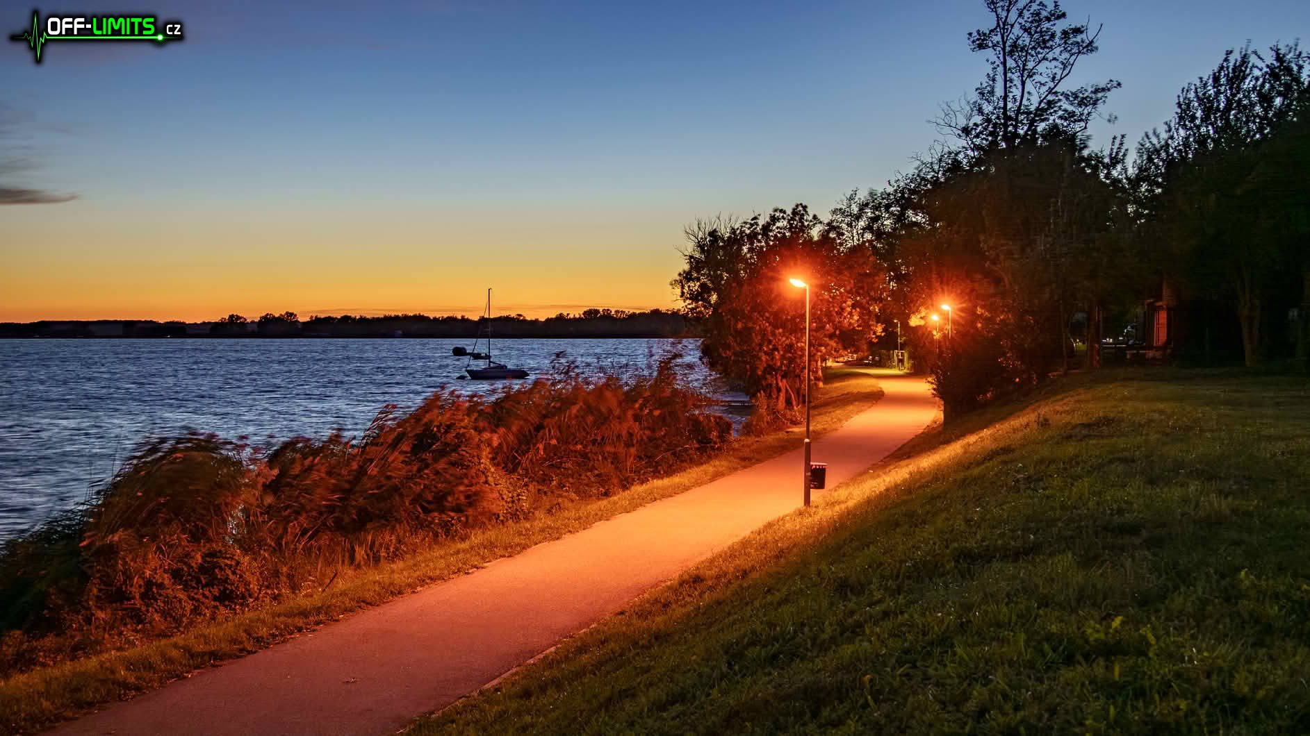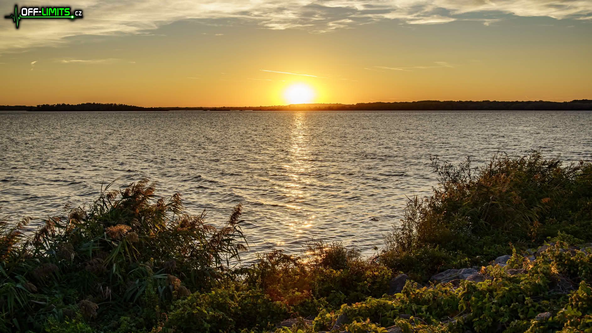 Když se po pár kilometrech jízdy lesem po cyklostezce dostávám opět k Dyji, ve stánku si dávám nějaké občerstvení. Pak už po břehu Dyje přejíždím do obce Bulhary. Opouštím rovinu a po žluté turistické značce stoupám na vrchol kopce Přítlucká hora (293), kde stojí rozhledna Maják. Po náročném výstupu mám opět podobný výhled do krajiny jako z rozhledny předchozí. Jen Pálavské kopce jsou blíž a slunce nad horizontem níž. Přes obec Zaječí přejíždím na vrchol nedalekého kopce Kalvárie (262), kde stojí rozhledna Dalibor. Výhledy jsou výrazně horší, takže po pár fotkách sjíždím po silnici do obce Šakvice. V místním obchodě naposledy doplňuji zásoby na cestu. Když následně projíždím po levém břehu dolní Novomlýnské vodní nádrže, koná se nádherný západ slunce. Když se dostanu ke střední nádrži, už je po západu. Pod rybářským dohledem se nahý vykoupu v přítoku řeky Svratka a připravím si čelovku s blikačkou na noční úsek.