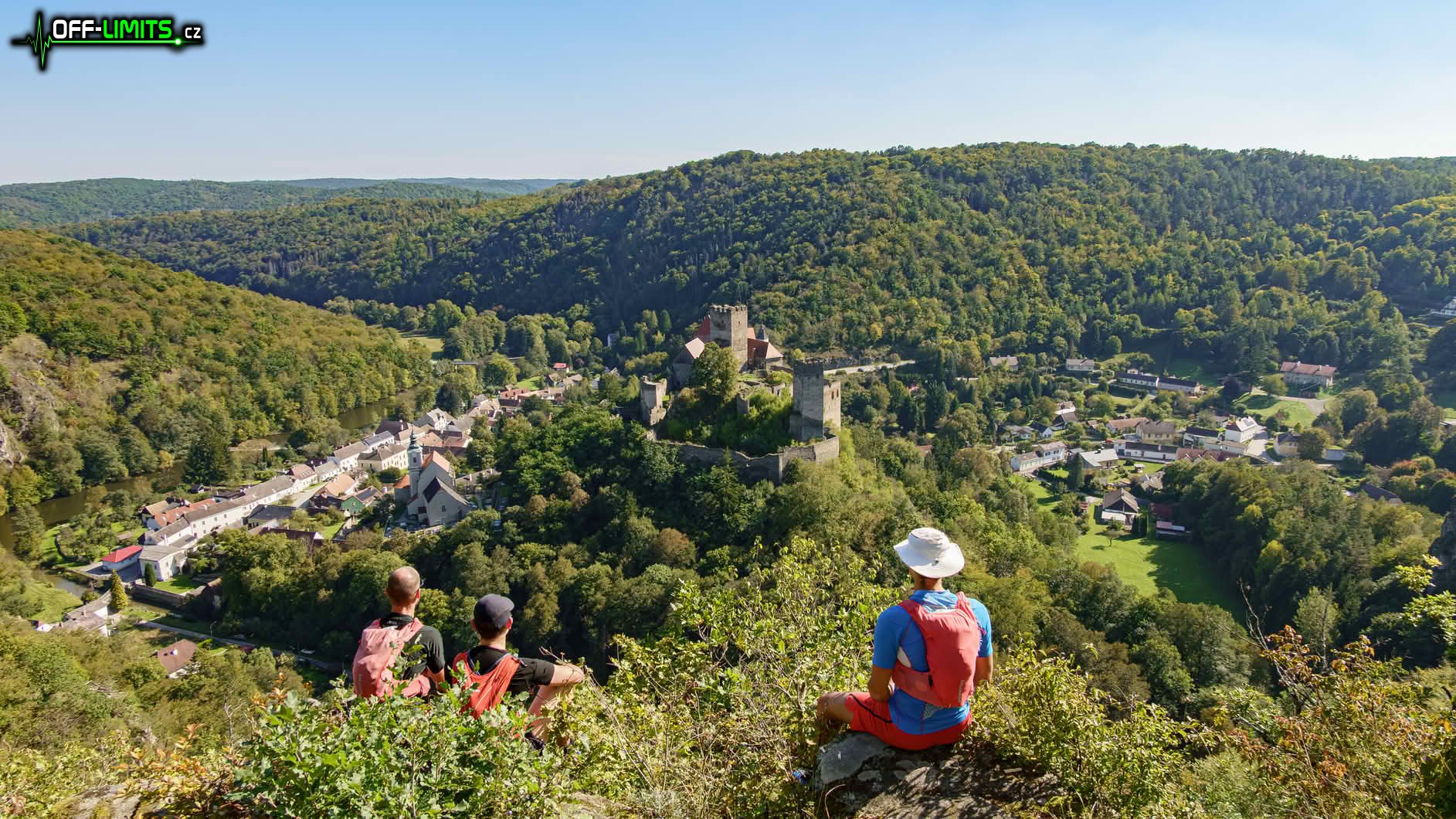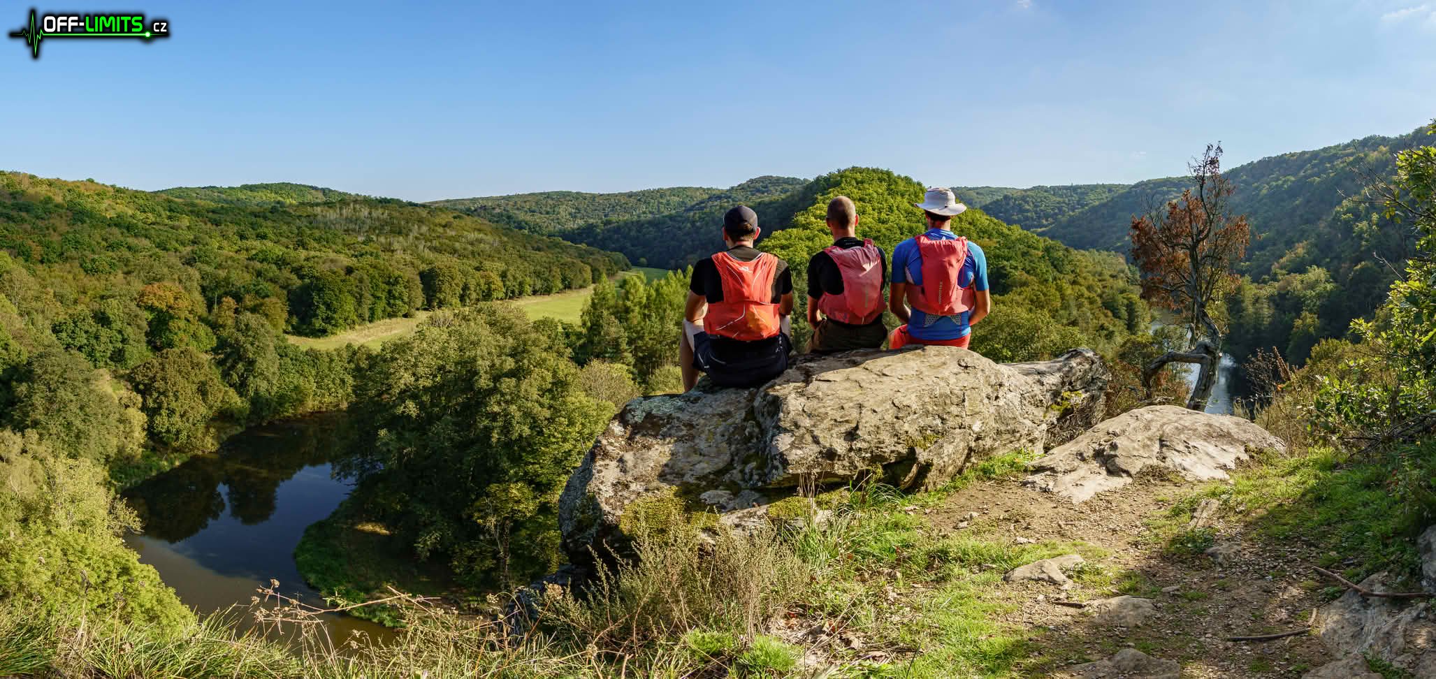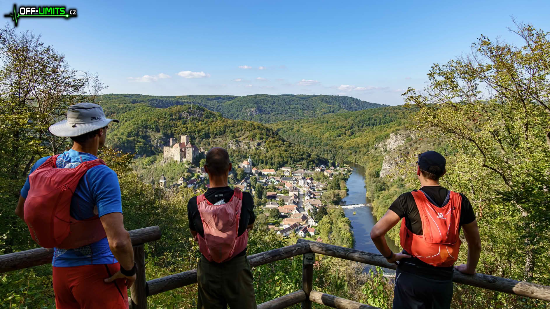 Přesun auty zabral docela dost času, takže jsme na trasu vyrazili až půl desáté dopoledne. Nejprve jsme zamířili na skalní vyhlídku Claryho kříž, ze které je krásně vidět na hráz Vranovské přehrady. Následně jsme přímo kolem hráze a přes Mniszkův kříž seběhli do obce Vranov nad Dyjí, kde jsme si v obchodě nakoupili zásoby na cestu. Hned za Vranovem jsme po červené turistické značce vběhli do národního parku Podyjí. Kolem Ledových slují jsme vystoupali k obelisku, od kterého je poslední výhled zpátky na Vranov.