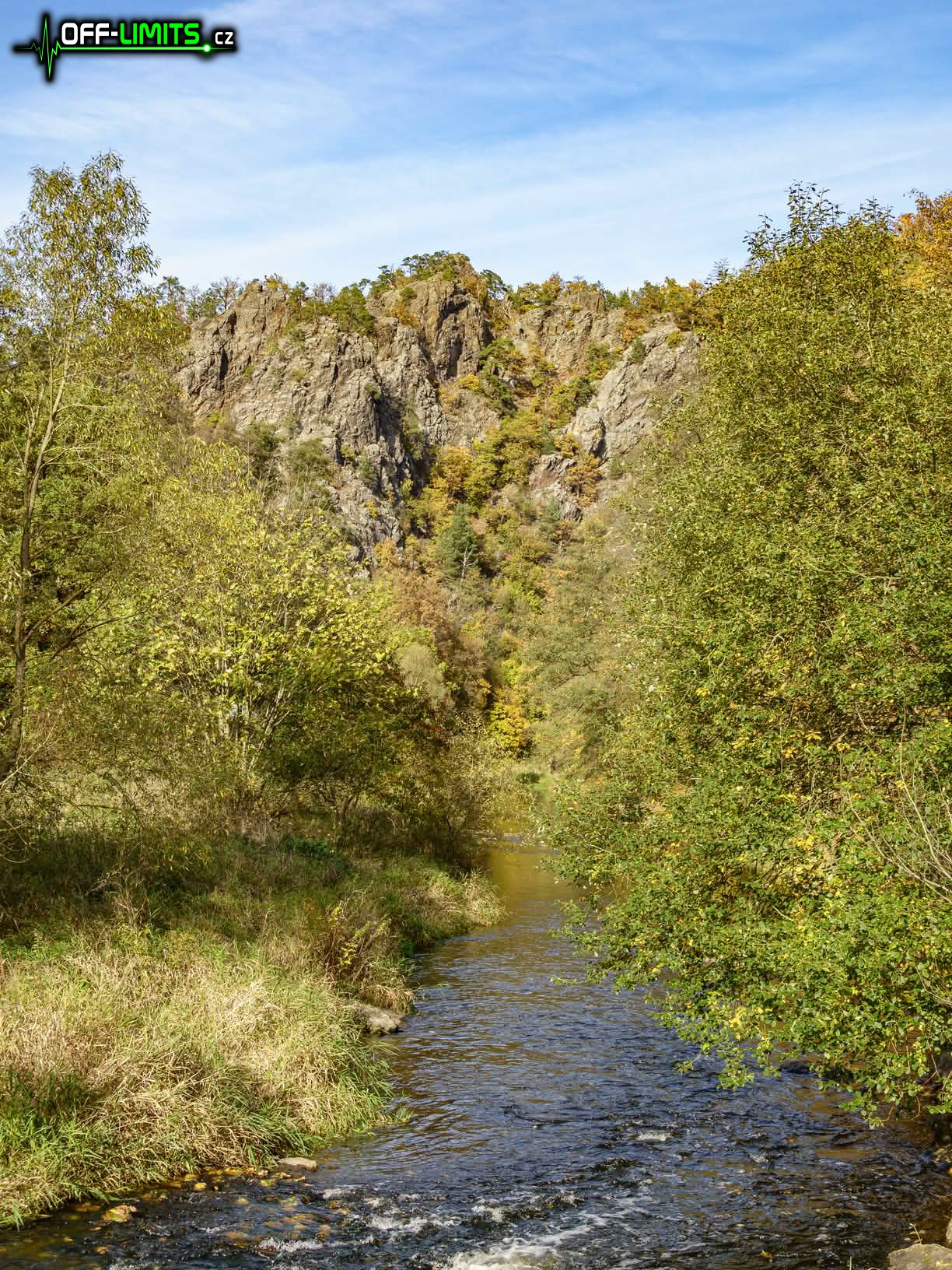 Řeka Oslava pod skalním hřebenem se zříceninou hradu Levnov (Ketkovický hrad)