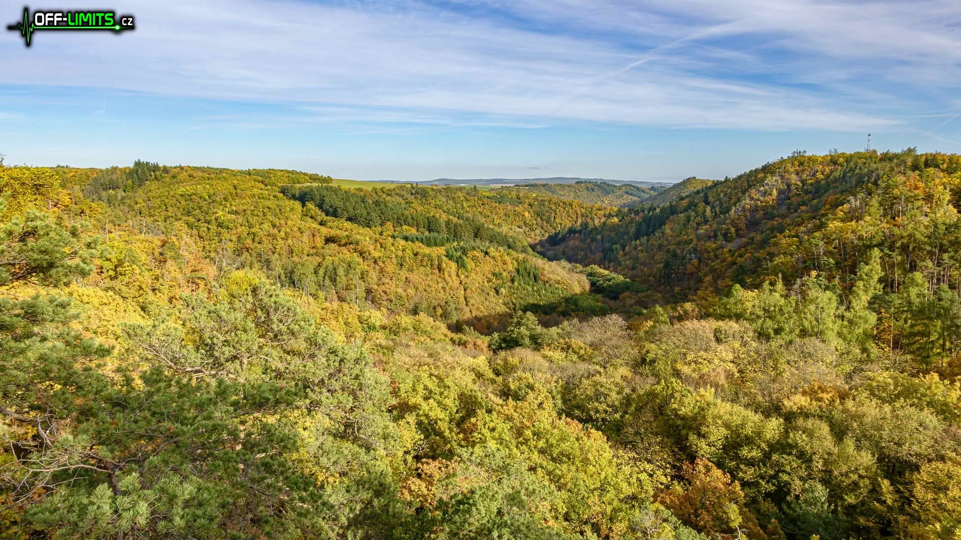Panoramatický výhled do údolí řeky Oslava a na skalní hřeben se zříceninou hradu Levnov (Ketkovický hrad) z vyhlídky Velká skála