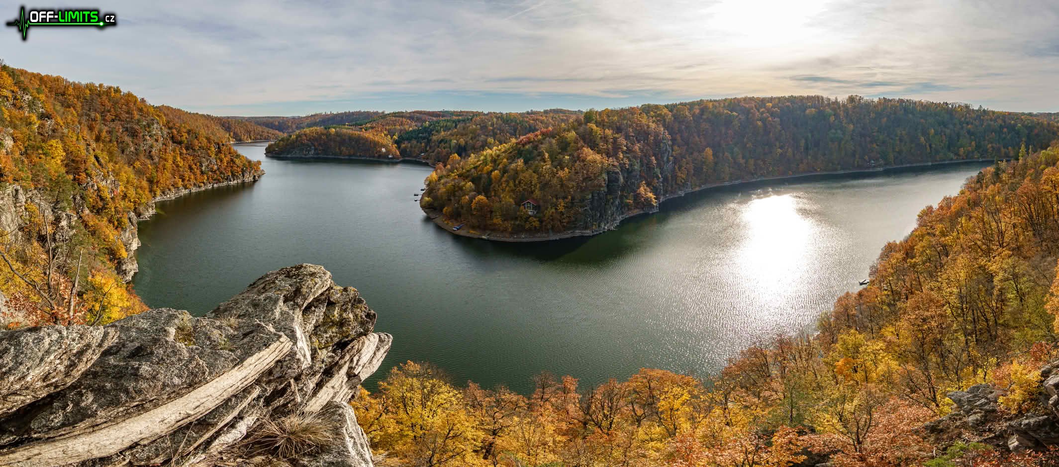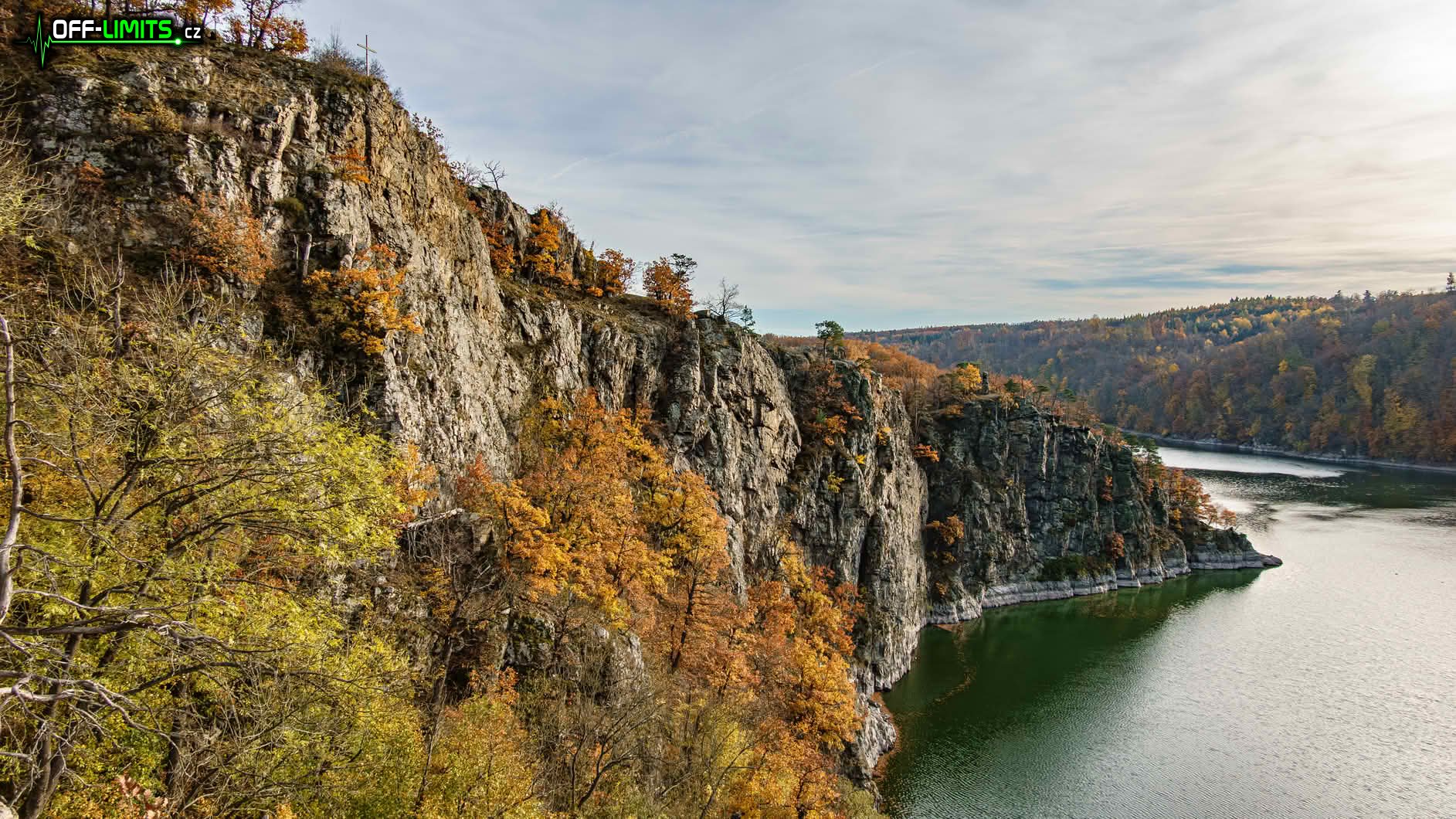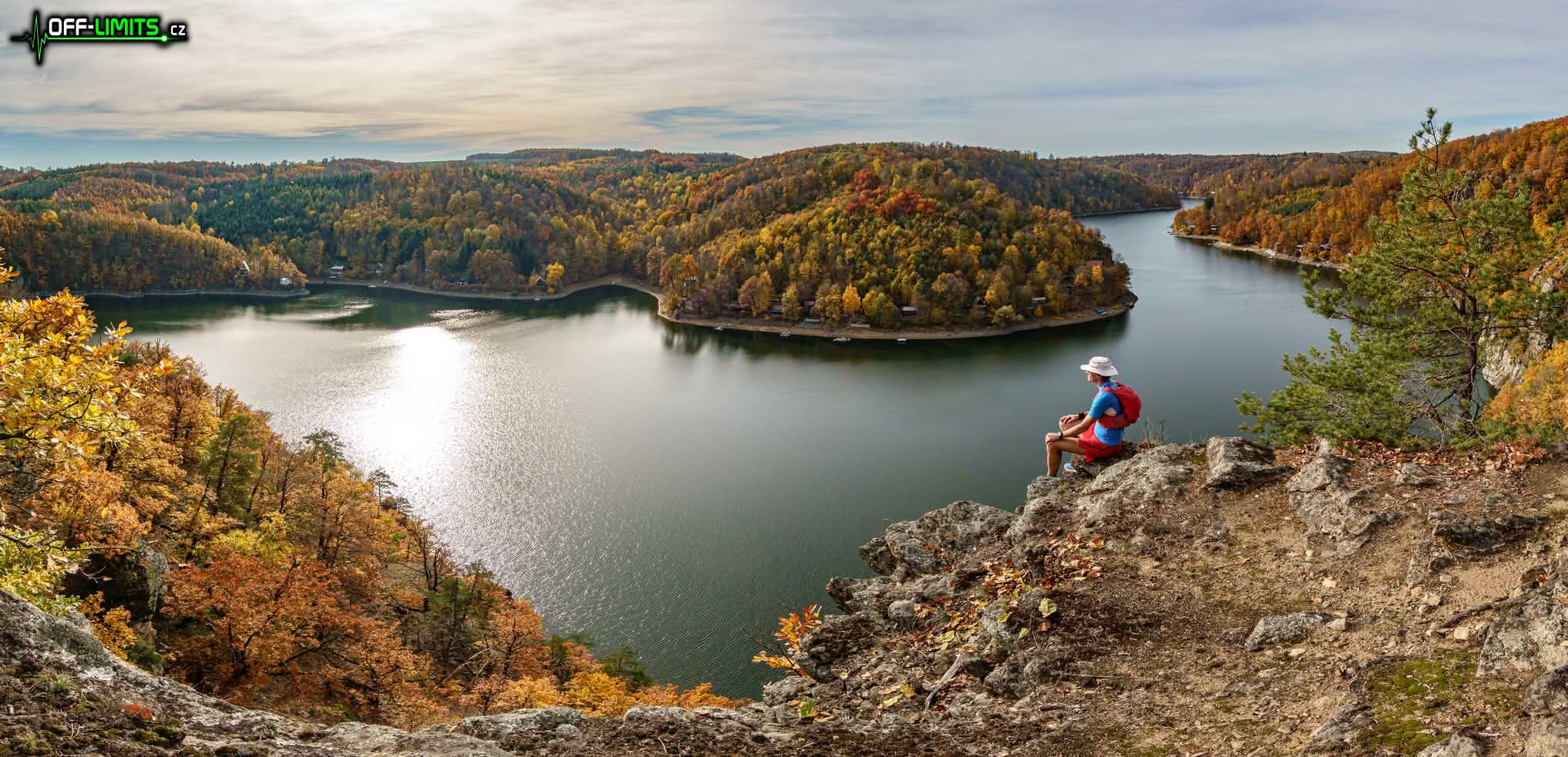 Nejprve jsem zamířil na skalní vyhlídku Claryho kříž, ze které jsem viděl ještě zbytky mlhy nad Vranovskou přehradou i dole v údolí ve Vranově nad Dyjí. Seběhl jsem dolů k hrázi a po visuté lávce nad Švýcarskou zátokou jsem se dostal na Vranovskou pláž. Bohužel tou dobou se od západu nasunula řídká oblačnost, která celou oblohu zahalila do bíla. Naprosto se tím zničila fotogeničnost jinak nádherné krajiny. Mezi rekreačními chatami jsem proběhl do přírodní památky Orlí hnízdo, odkud je z Eduardovy skály pěkný výhled na přehradu. Další úsek byl nejnáročnější, protože jsem napříč lesem mimo cesty přeběhl do přírodní památky Petrovy skály, kde jsem následující více než hodinu prolézal obří skály opět s krásnými výhledy na údolní nádrž.