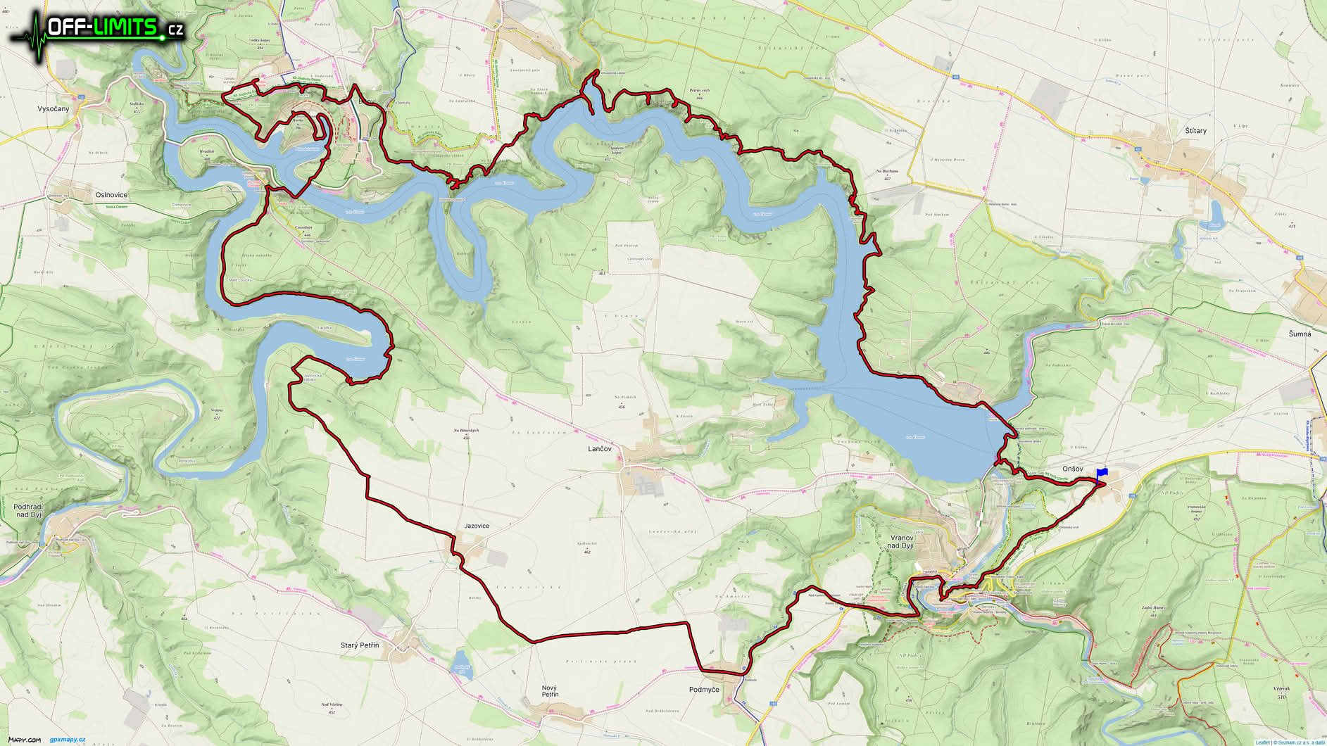 Proběhl jsem přes Chvalatickou zátoku a po krátké cestě kolem chat jsem vystoupal do přírodní rezervace Růžový vrch, odkud je z různých míst výhled na poloostrov Babka. Pak už jsem po cestě vystoupal do obce Bítov. Proběhl jsem Bítovskou zátoku, navštívil skalní vyhlídky Hvězdička i Čertice, kde mi akorát zapadlo slunce. Oblékl jsem si bundu, nasadil čelovku s blikačkou a vyrazil na zpáteční cestu. Nejprve jsem vystoupal ke zřícenině hradu Cornštejn, od které jsem pokračoval přes Malé Loučky a přírodní rezervaci Na Bítovské cestě až do Jazovické zátoky. To byla poslední část kolem přehrady. Vystoupal jsem proto do obce Jazovice a přes obec Podmyče přeběhl do obce Vranov nad Dyjí. Pak už zbývalo pouze vystoupat zpátky do obce Onšov k autu. Protože další den jsme měli společný výběh s kamarády, ani jsem si doma neuklízel věci a nechal si je připravené na ráno.