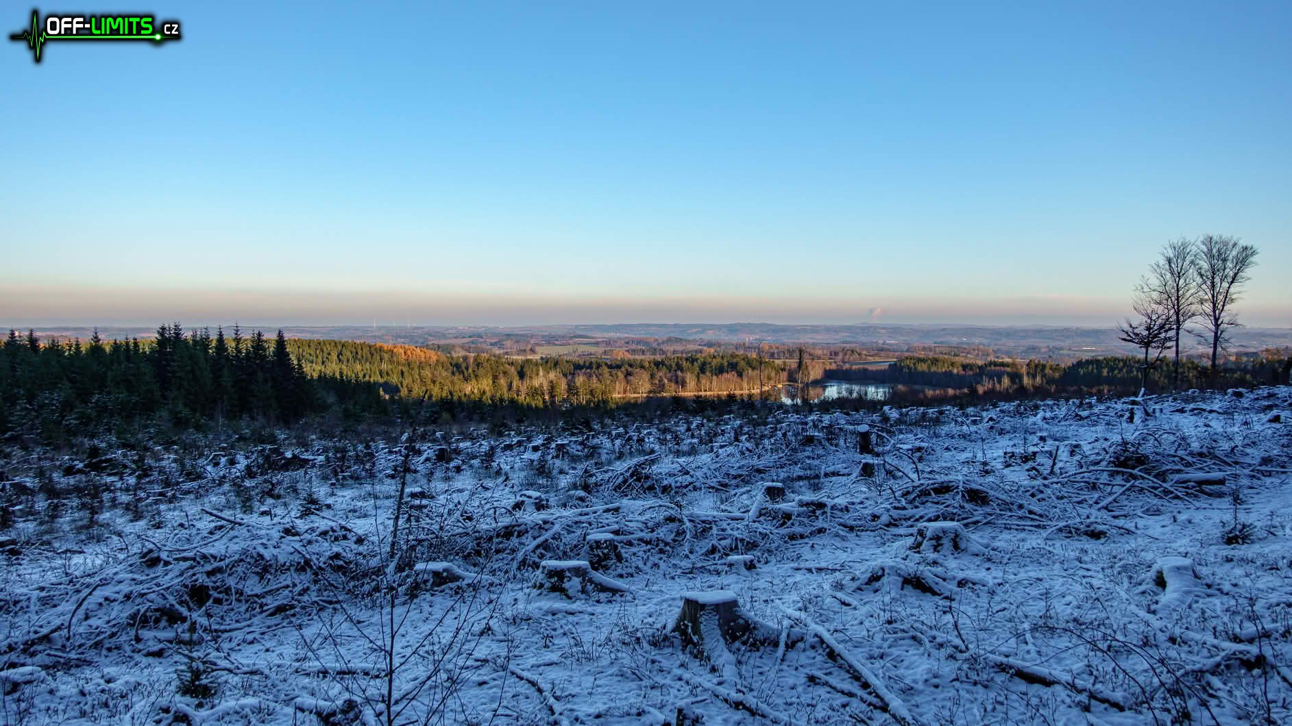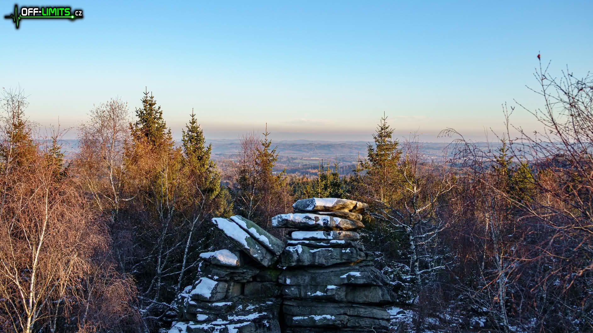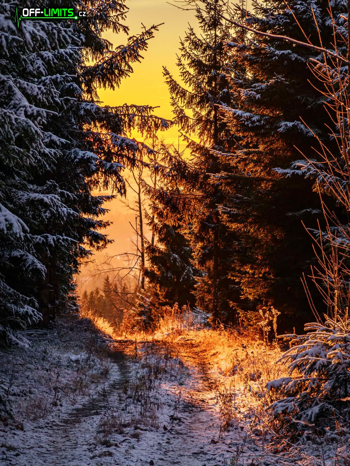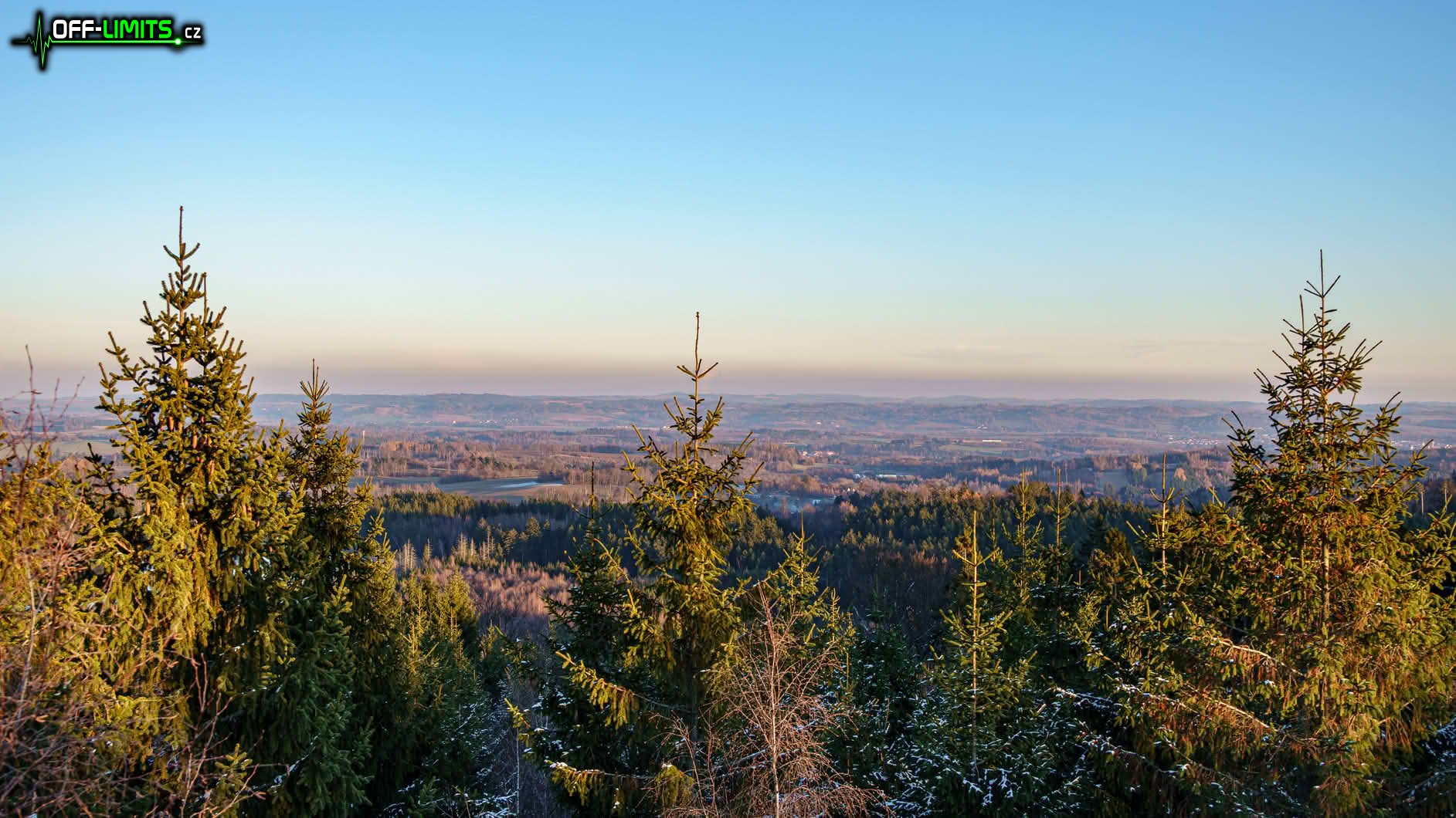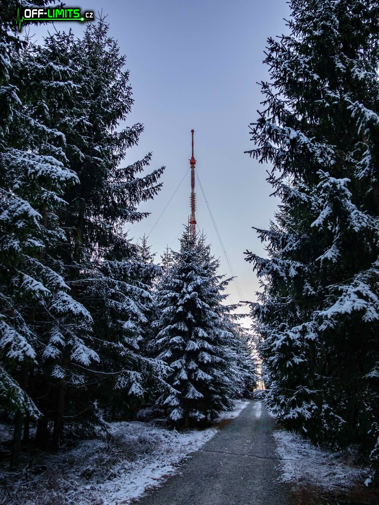 Nyní následoval dlouhý, rovný úsek v potemnělém lese po modré značce kolem Malého pařezitého rybníka až k Míchově skále. Bylo akorát půl hodiny před západem slunce, takže poslední sluneční paprsky osvětlovaly pouze vršek skály. Výhledy přes okolní stromy už zde poslední roky téměř nejsou, takže jsem se tam moc dlouho nezdržoval a vydal se na závěrečný výstup na vrchol kopce Javořice (837). Čím výše jsem byl, tím více se okolo objevoval sníh. Později už byl i na větvích a těsně okolo vrcholu byly omrzlé dokonce i celé stromy. U vysílače na vrcholu jsem byl přesně ve čtyři hodiny odpoledne. Rychle jsem tedy přeběhl na jihozápadní úbočí, kde jsem měl posledních pár minut výhled na zapadající slunce.