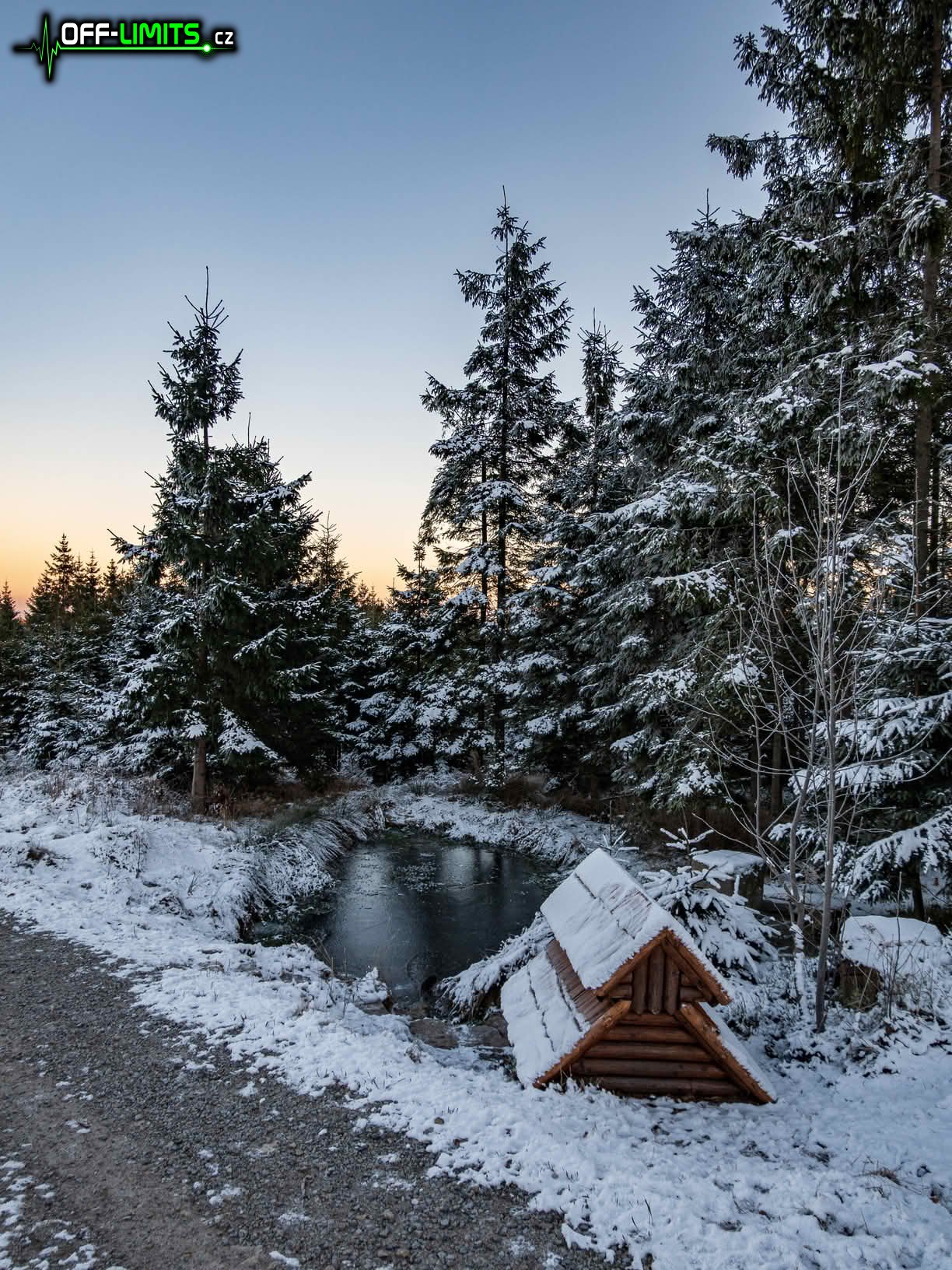 Ve stmívající krajině jsem přes obec Lhotka seběhl po zelené značce do obce Horní Bolíkov. Bez slunečních paprsků teplota rychle začala padat pod bod mrazu. Trochu jsem se přioblékl, nasadil čelovku a dál pokračoval až na vrchol kopce Hradisko (760), který byl také pod slabou vrstvou sněhu. Raději jsem si ještě nastavil v hodinkách opakovaný odpočet, abych nezapomněl pravidelně pít a nezamrzlo mi tak pití ve vaku. Proběhl jsem obcí Poldovka a po modré značce vystoupal na nedaleký kopec Bradlo (672), kde stojí dřevěná socha čerta. Následovalo klesání do obce Olší, za kterou mě čekal poslední kopec Zdeňkov (671). Když jsem na druhé straně sbíhal do obce Dobrá voda, teploměr mi ukazoval dokonce rovných -10 stupňů. Jako poslední jsem ještě navštívil malý zatopený lom V Hoře a po osmé hodině večerní se vrátil k autu.