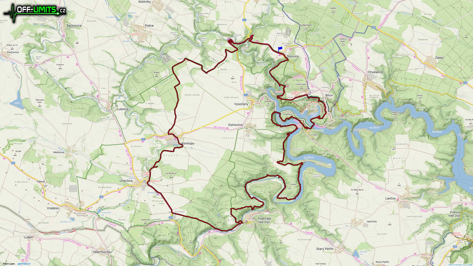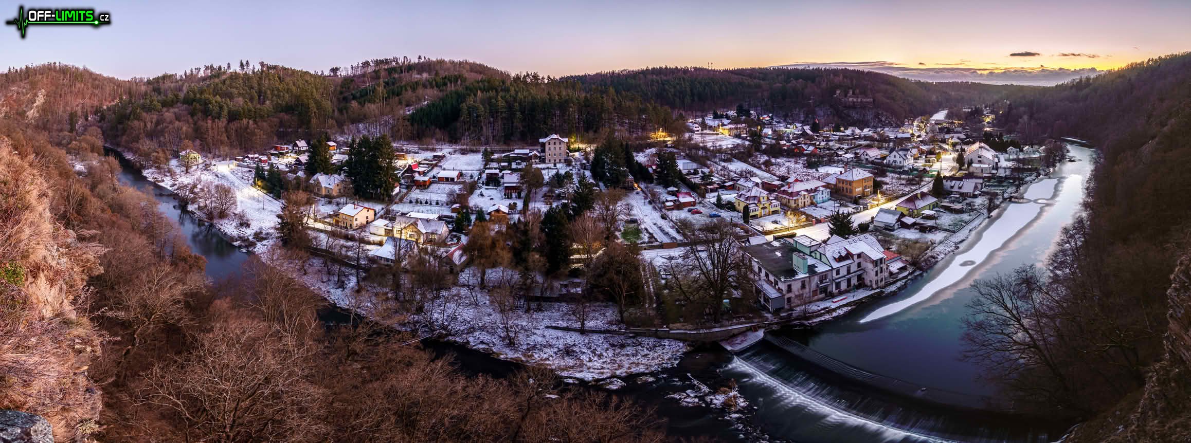 Pokračoval jsem proti proudu přes rekreační oblasti Farářka až na Penkýřky a celou dobu byla zamrzlá stále celá plocha. Dokonce šlo na led opět bezpečně nastoupit. Tou dobou už se mi ale neběželo dobře, protože jsem cítil nohy z předchozího 100km bruslení. Když skončila přehrada, zamrzlá část sahala ještě asi 1 km proti proudu řeky Dyje. Led sice skončil a slunce zapadlo, ale já pokračoval dál. Po několika kilometrech jsem vystoupal do přírodní rezervace Podhradské skály, ze které jsem měl už za šera výhled na obec Podhradí nad Dyjí. Nasadil jsem čelovku s blikačkou a vyrazil na zpáteční cestu.