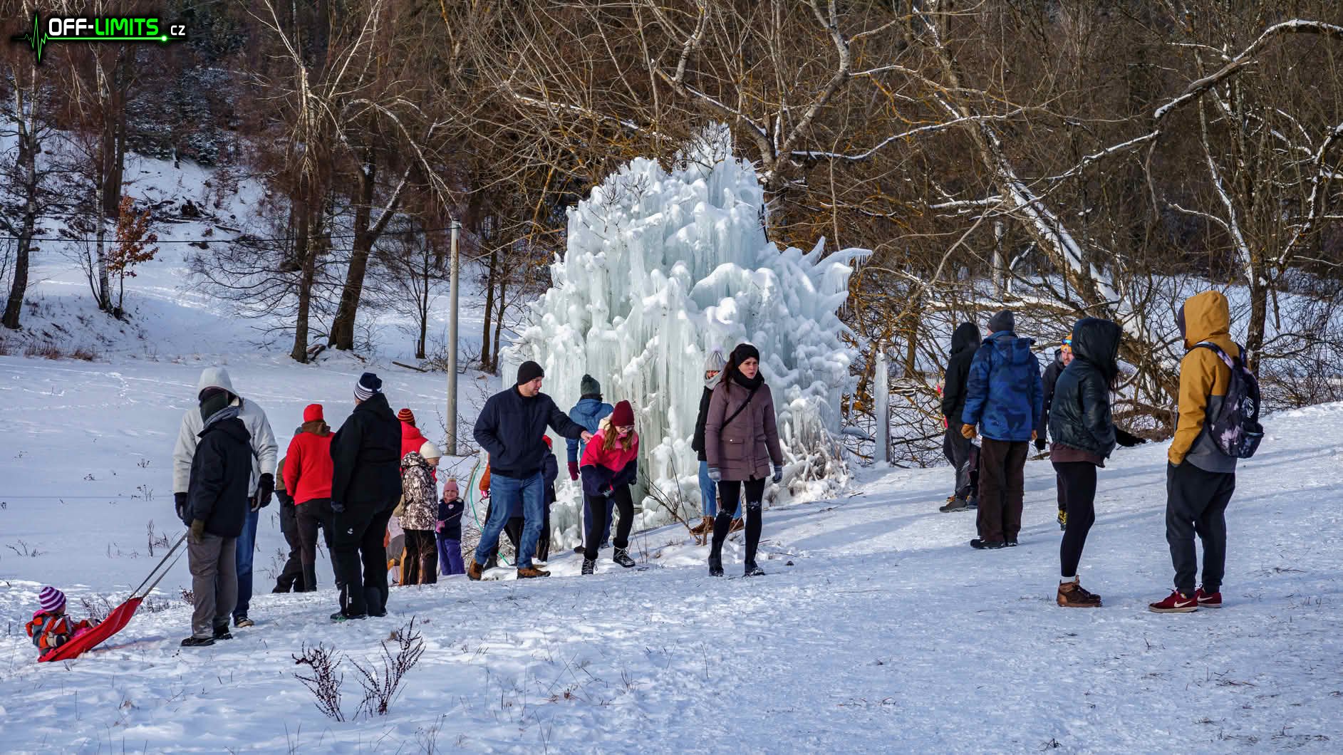 Kousek za hradem jsem si oběhl zamrzlý zatopený lom Řásná, okolo kterého už se proháněli běžkaři ve vyšlapaných stopách. Tou dobou se ovšem od severovýchodu začala tlačit nepříjemná oblačnost. Když jsem o něco později probíhal po hrázi Velkého pařezitého rybníka, bylo už téměř zataženo. Bez větších zastávek jsem proto minul Plodový rybník a zatopený lom Řídelov. Zastavil jsem se za obcí Řídelov, kde se nacházel další umělý ledopád, úplně obklopený davem lidí.