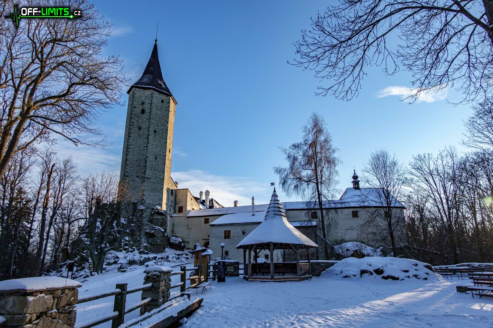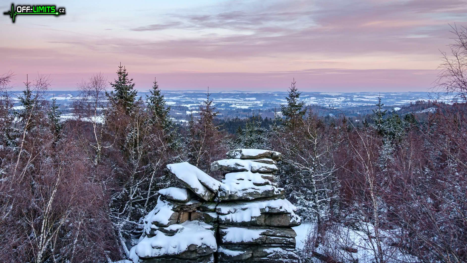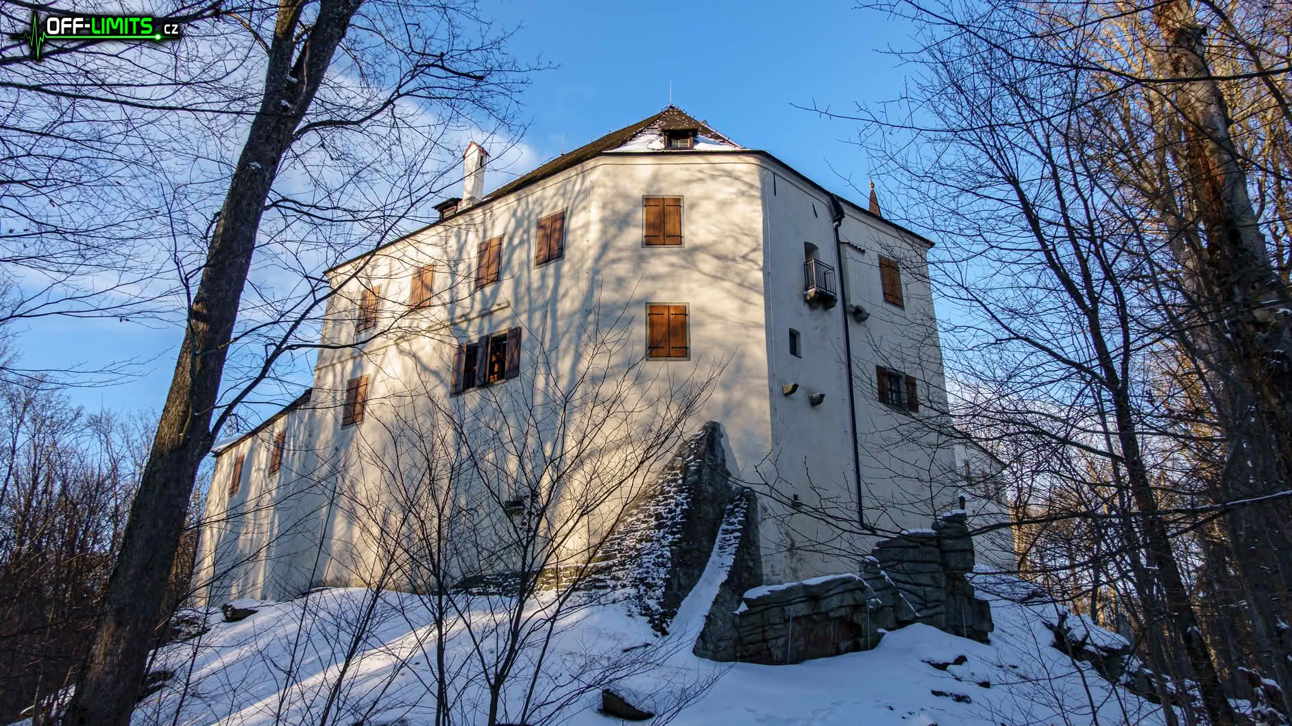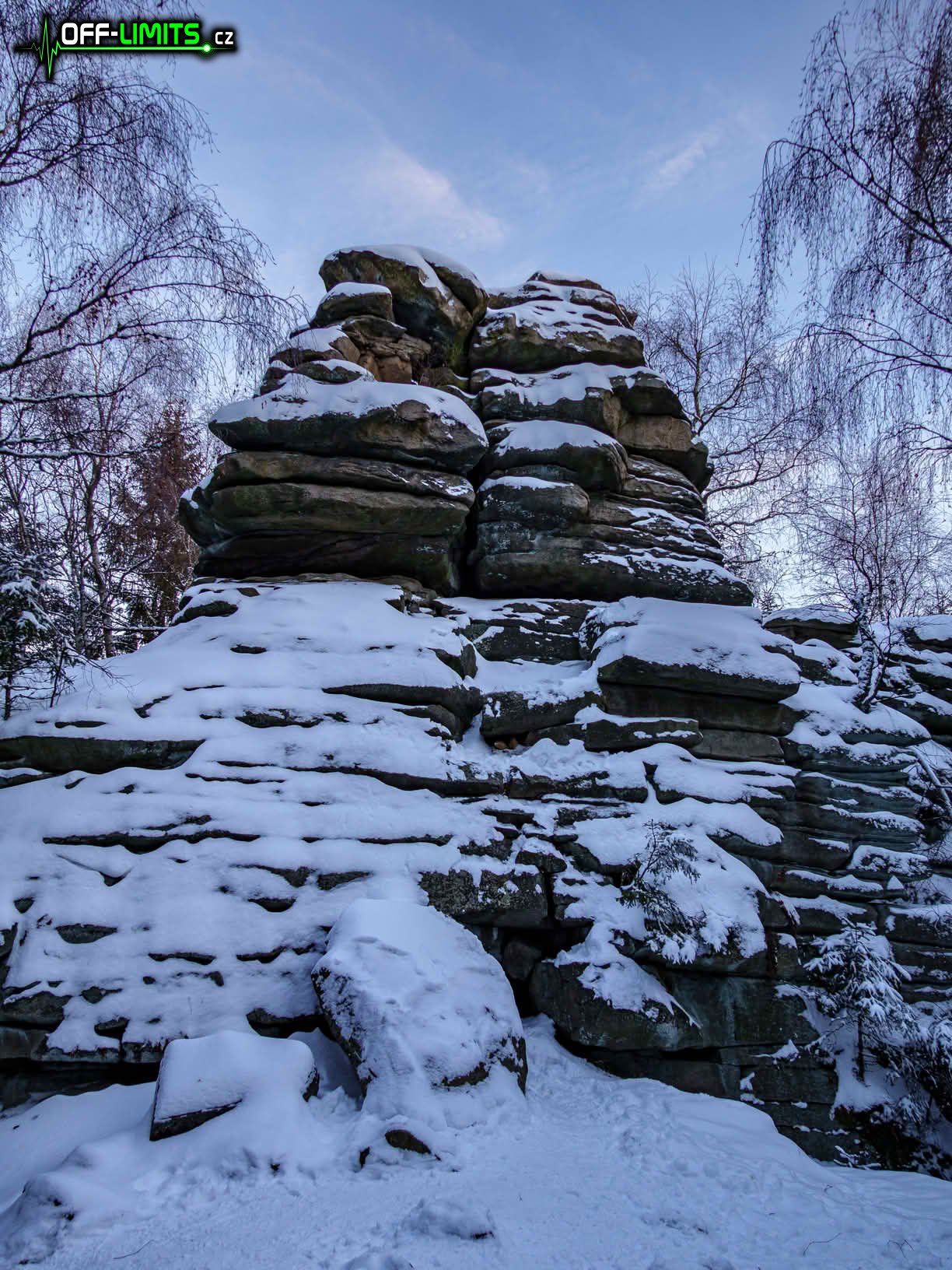 Když jsem o něco dál probíhal kolem Roštejnské obory, opět se začala objevovat modrá obloha. Po vystoupání k hradu Roštejn jsem se občerstvil z nesených zásob a chvíli drbal hradní kočku, která se zde neustále potuluje po okolí. I když opět svítilo slunce, mě čekal více než hodinový úsek lesem, kde jsem měl stín. Když jsem po 6 km vystoupal po zelené značce na Míchovu skálu, do západu slunce zbývala poslední čtvrt hodina. Bohužel se mi kvůli mrazu rozbila noha u stativu, takže jsem fotku na skále musel oželet.