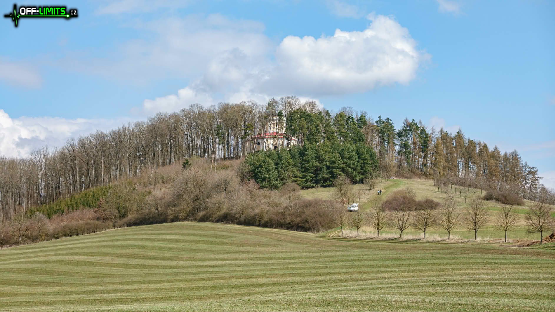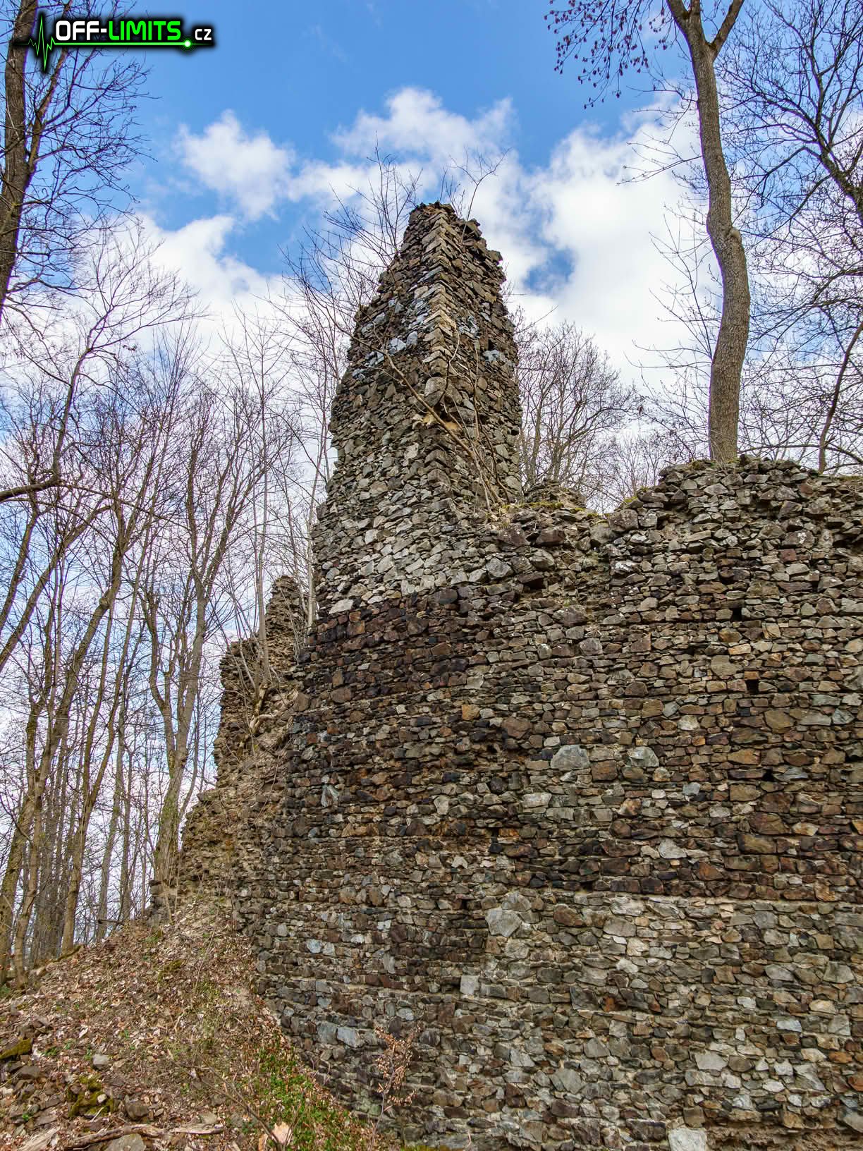 Další úsek byl docela náročný, protože jsem musel vystoupat po modré značce téměř 5 km s převýšením 315 m až na vrchol kopce Koráb (775). Protože nahoře fučelo, v krátkém oblečení mi bylo trochu zima. Krátce jsem vystoupal na 50 m vysokou rozhlednu, ale protože kvůli oblačnosti výhledy moc zajímavé nebyly, po pár minutách už jsem pokračoval dál. Po hřebenové cestě jsem se dostal ke zřícenině hradu Nový Herštejn, která překvapila svou velkou rozlohou na vrcholku bezejmenného kopce. Po červené značce jsem přes hradiště Příkopy a obec Podzámčí vystoupal na vrchol kopce Rýzmberk (665), kde se nachází stejnojmenná zřícenina hradu. Tím skončilo běhání po kopcích a přišel čas návratu.