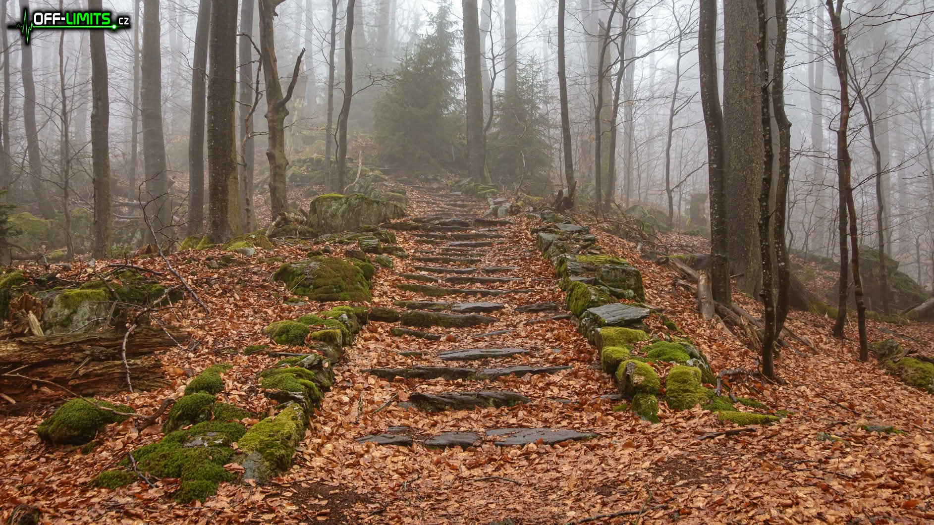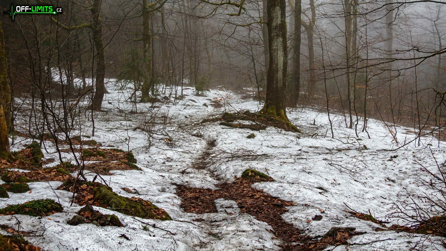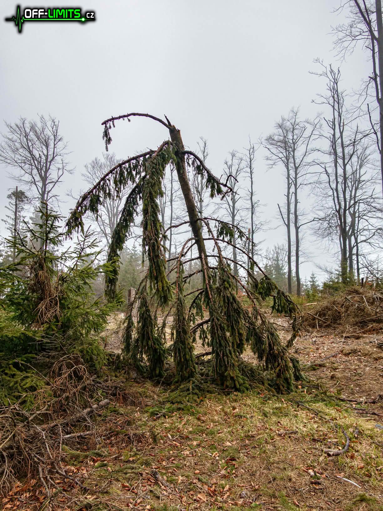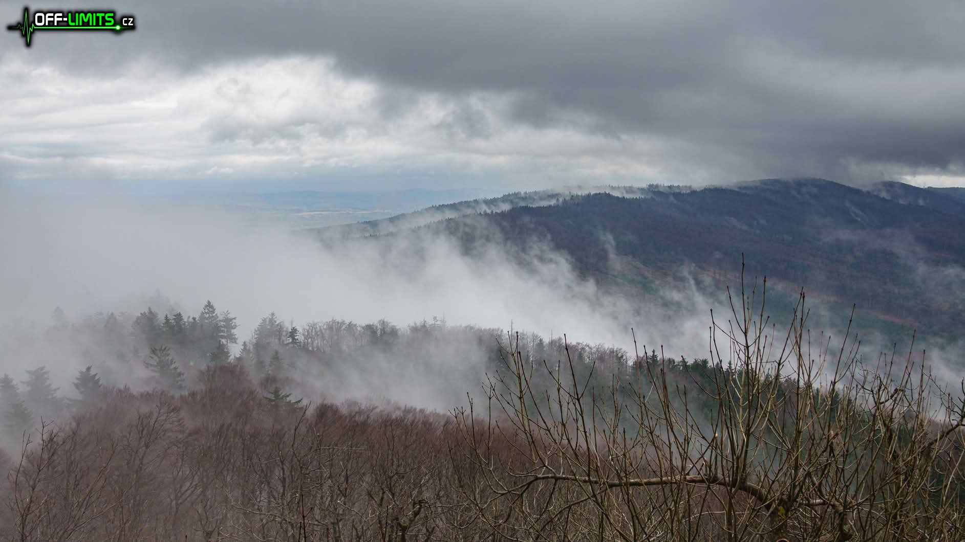 Z vrcholu jsem seběhl po zelené značce o něco níže, kde jsem se připojil na značku červenou. Ta mě vedla následujících asi 20 km stále v mraku s občasným deštěm po hřebenové cestě přes osadu Capartice i vrcholy kopců Sádek (854), Sádkova skála (847), Haltrava (882), Škarmanka (888) a Velká skála (852) až na vrchol kopce Starý Herštejn (878), kde se nachází stejnojmenná zřícenina hradu i rozhledna. Obzvláště zajímavý byl úsek kolem vrcholu Sádek (854), kde bylo strašně moc polámaných stromů kvůli námraze, které tam byly ještě velké hromady právě pod zlámanými stromy. Z rozhledny na zřícenině hradu Herštejn jsem měl překvapivě dobré výhledy, protože se nacházela pod úrovní mraků. Díky tomu jsem mohl vidět v dálce německé město Waldmünchen (Mnichov nad Lesy), kam se mělo jet následující den. Také bylo dobře vidět, jak se dole v lesích tvoří mlha, která se pak díky silnému větru přelévá přes hřeben a mizí v České republice. Po silnici jsem oběhl kopec Lysá (870) a začal se vracet.