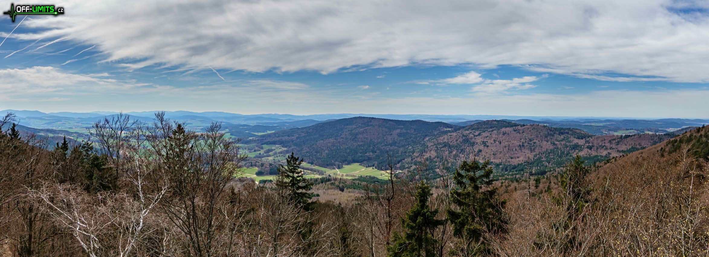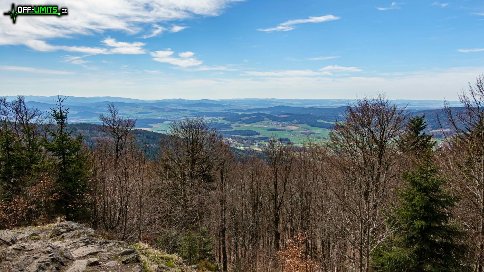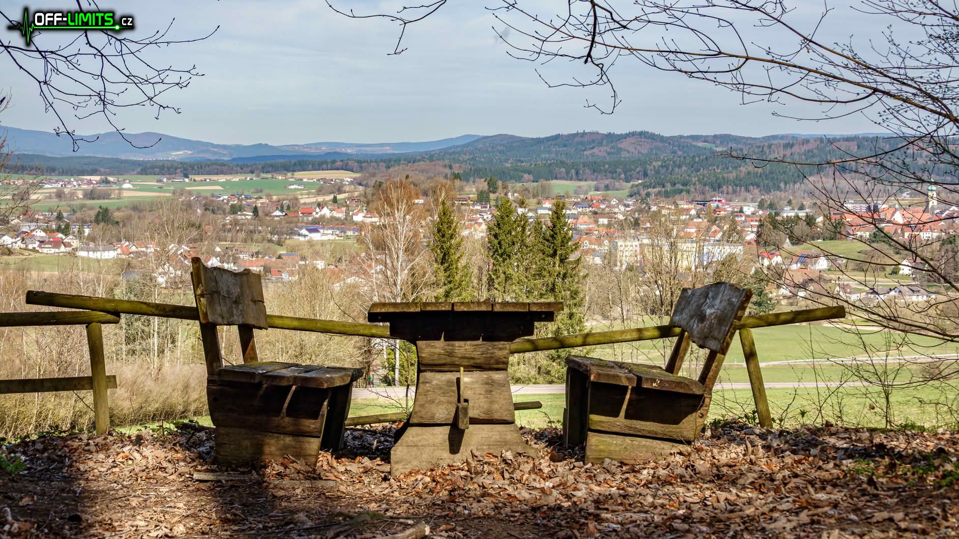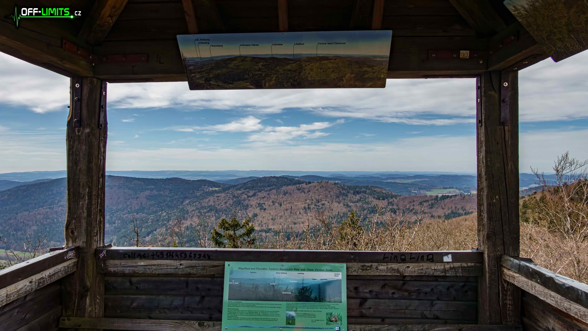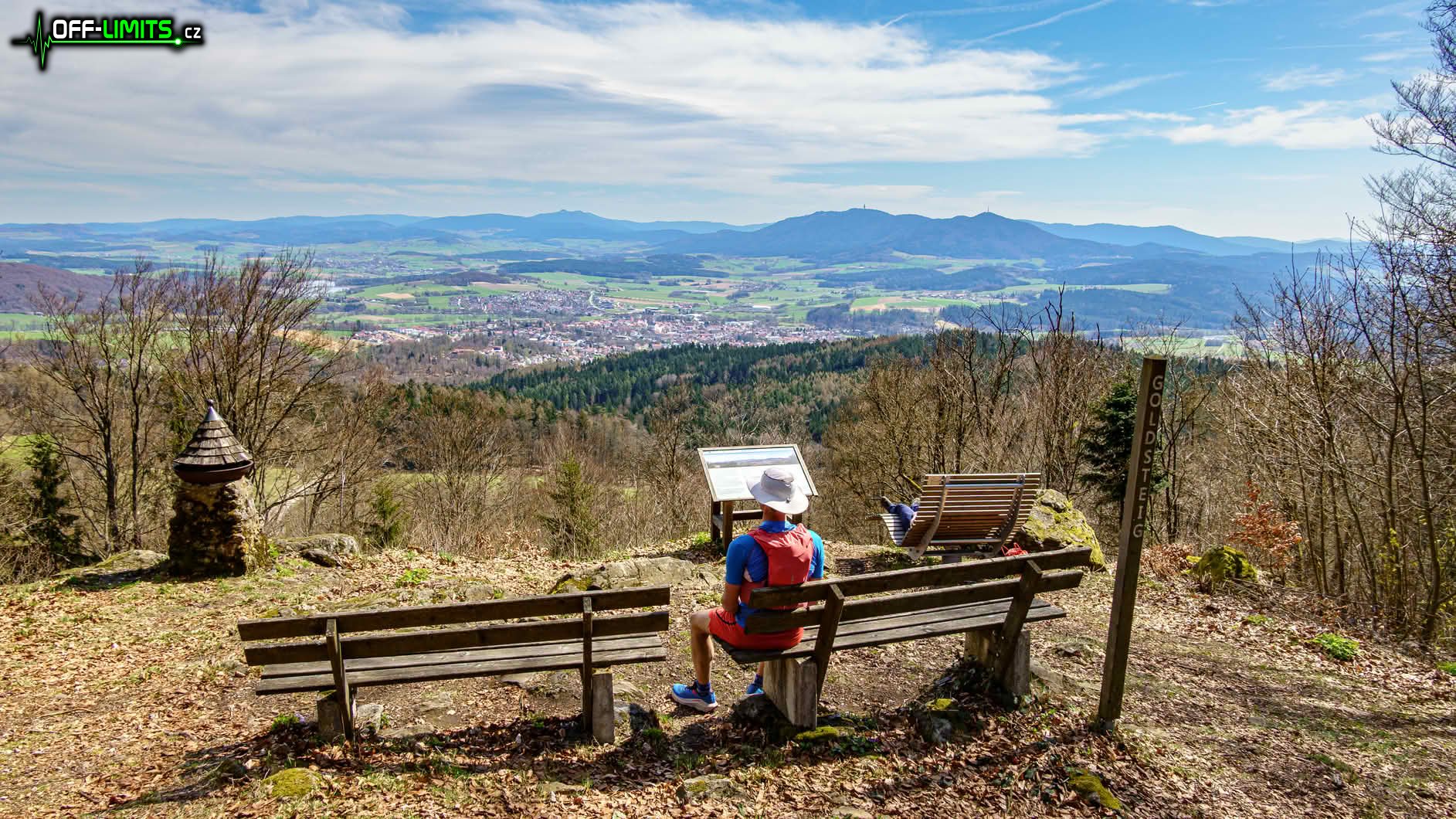 Asi v polovině výstupu jsem proběhl obcí Herzogau, kde už začaly první výhledy po krajině. Po dalších pár kilometrech jsem odbočil na hřeben a vystoupal tak na vrchol kopce Klammerfels (848), kde stojí stará, dřevěná rozhledna. Výhledy z ní sice byly všemi směry, ale bohužel už těsně přes vrcholky okolních stromů. Po návratu na hlavní cestu jsem se potkal s rodiči, protože zapomněli odbočit na rozhlednu a cestu si tak výrazně zkrátili. Následoval výstup po malé sjezdovce Althütte k horské chatě Gibacht. Další úsek jsem kličkoval kolem hlavní turistické cesty, protože okolo ní je roztroušeno několik skalních vyhlídek. První se nacházela na vrcholu kopce Tannenriegel (910) a výhled z ní byl na jih do údolí a na vzdálené kopce. Druhá byla kousek pod vrcholem kopce Reiseck (902) a výhled byl orientován na údolní město Furth im Wald (Brod nad Lesy). Třetí, poslední a nejhezčí vyhlídka byla na vrcholu kopce Gaißriegel (720) s výhledem opět na město Furth im Wald. Tím výhledy skončily, protože už jsem byl téměř na konci hřebenu.