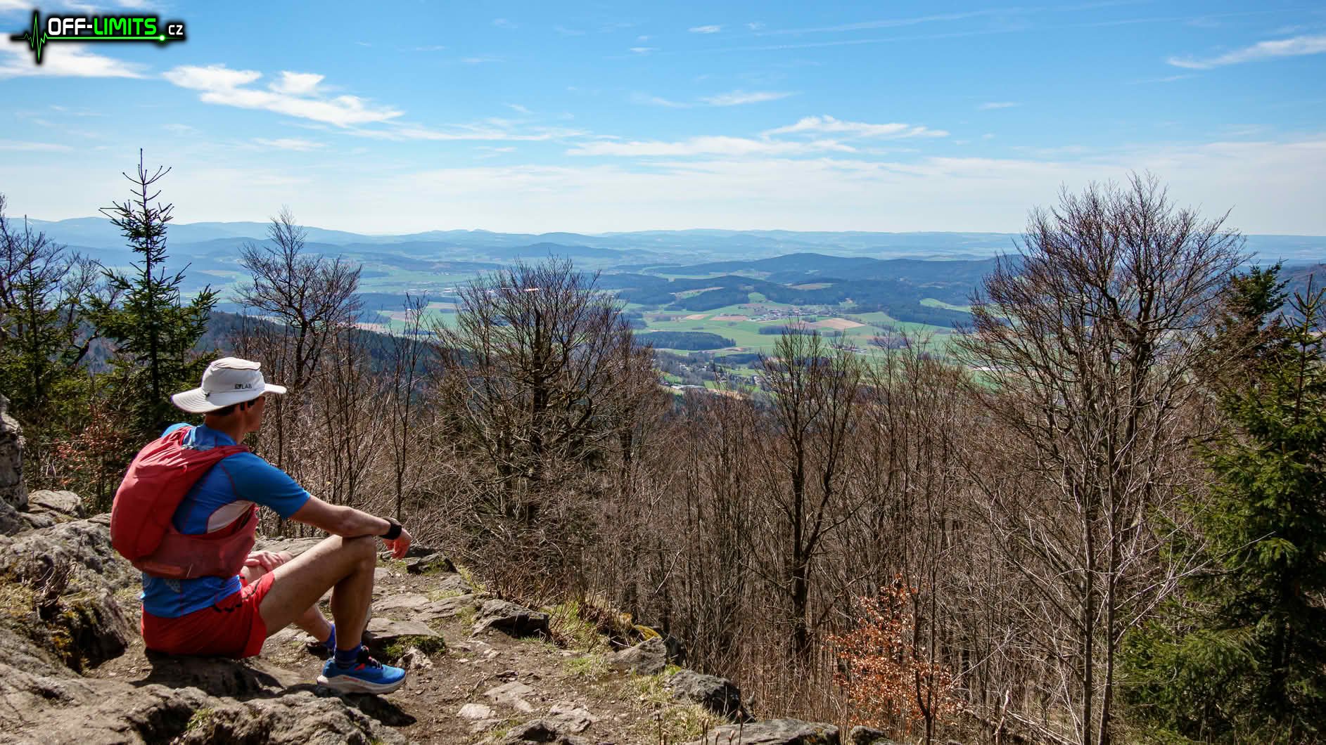 Na Velký pátek jsme ráno přejeli autem k zatopenému lomu Lomeček u obce Starý Klíčov. Zatímco ostatní obdivovali podvodní svět skrz pozorovatelnu, já jsem po obhlédnutí lomu vyrazil na celodenní běh. Po modré značce jsem přeběhl k obci Nový Klíčov, kde se mi otevřely první výhledy jak na pohoří Českého lesa, tak i na Bavorský les (německou část Šumavy - Böhmerwald). Odbočil jsem na červenou značku a přes osadu Studánky seběhl do obce Všeruby nedaleko státní hranice. Tou dobou už bylo příjemně teplo, takže jsem sundal dlouhé oblečení, schoval ho do batohu a dál pokračoval v krátkém.