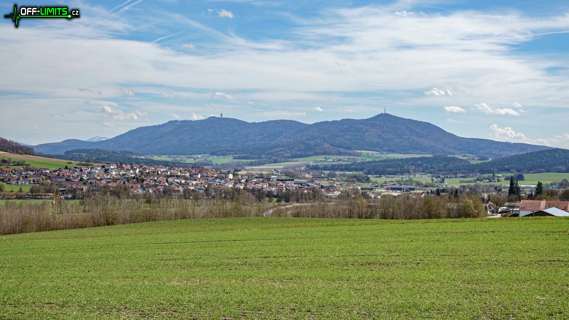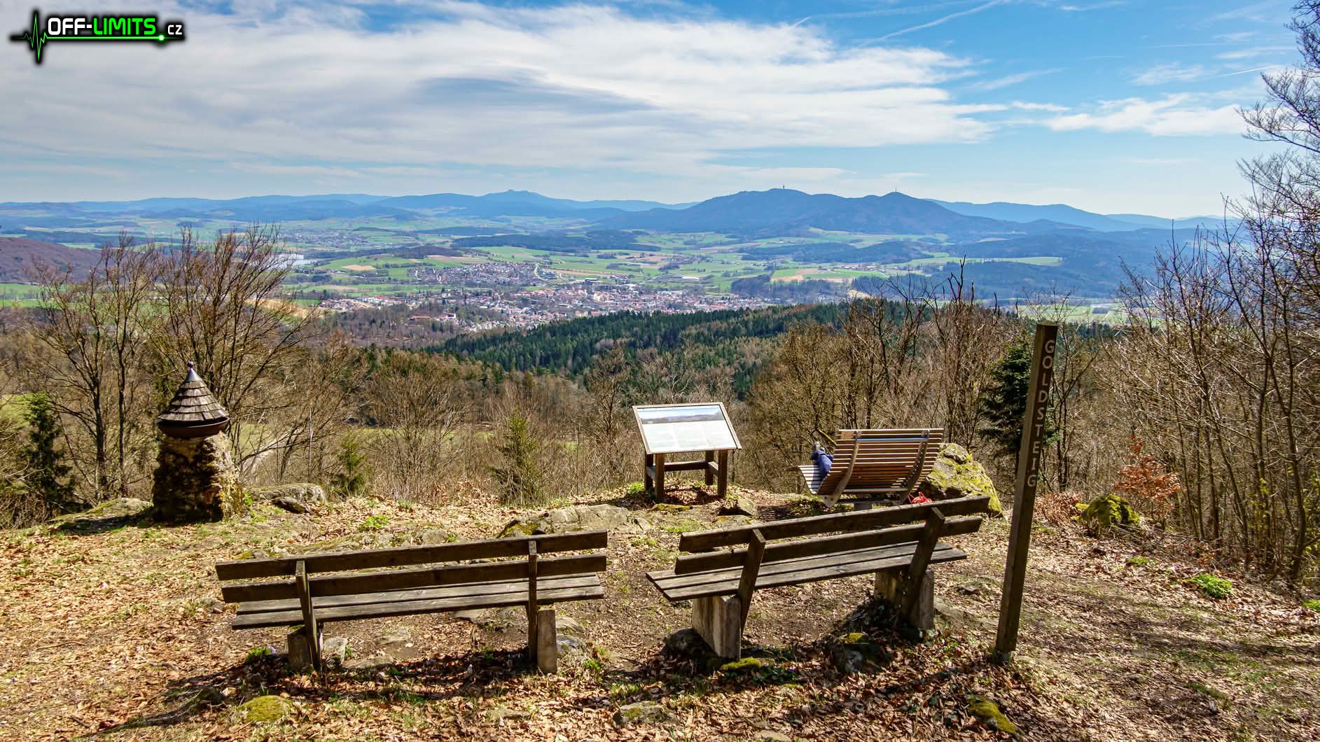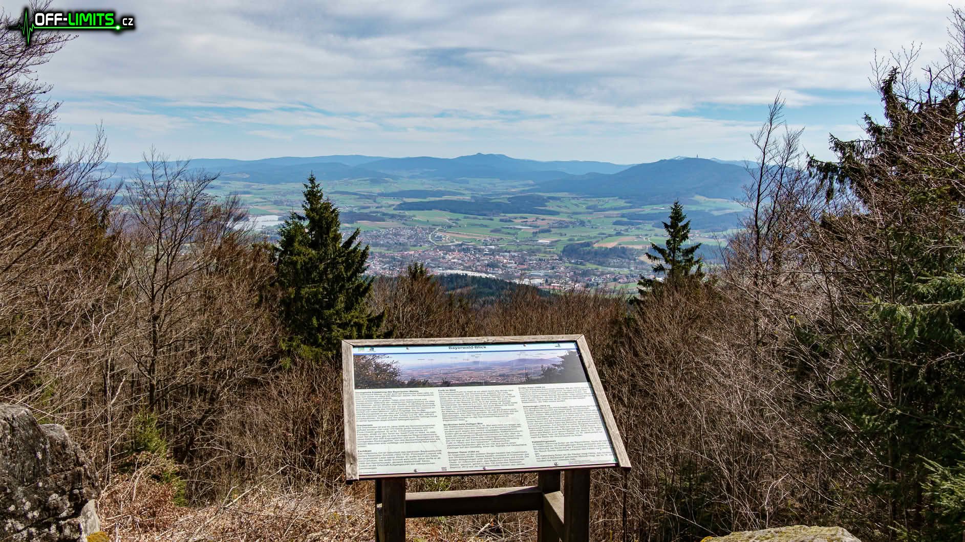 Asi v polovině výstupu jsem proběhl obcí Herzogau, kde už začaly první výhledy po krajině. Po dalších pár kilometrech jsem odbočil na hřeben a vystoupal tak na vrchol kopce Klammerfels (848), kde stojí stará, dřevěná rozhledna. Výhledy z ní sice byly všemi směry, ale bohužel už těsně přes vrcholky okolních stromů. Po návratu na hlavní cestu jsem se potkal s rodiči, protože zapomněli odbočit na rozhlednu a cestu si tak výrazně zkrátili. Následoval výstup po malé sjezdovce Althütte k horské chatě Gibacht. Další úsek jsem kličkoval kolem hlavní turistické cesty, protože okolo ní je roztroušeno několik skalních vyhlídek. První se nacházela na vrcholu kopce Tannenriegel (910) a výhled z ní byl na jih do údolí a na vzdálené kopce. Druhá byla kousek pod vrcholem kopce Reiseck (902) a výhled byl orientován na údolní město Furth im Wald (Brod nad Lesy). Třetí, poslední a nejhezčí vyhlídka byla na vrcholu kopce Gaißriegel (720) s výhledem opět na město Furth im Wald. Tím výhledy skončily, protože už jsem byl téměř na konci hřebenu.